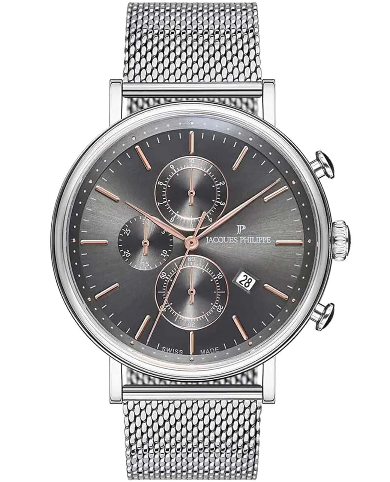 Швейцарские мужские часы-хронографХронографФункция позволяет измерять отрезки времени с особой точностью: часы, минуты, секунды. Верным признаком хронографа является наличие на циферблате 3 дополнительных окошек-счётчиков. Jacques Philippe Aviator JPQGC021246N кварцевый механизм с высокой точностью. Прочное сапфировое стеклоСапфировое стеклоПрочный и надёжный материал из кристалла сапфира синтетического происхождения, характеризующийся особой твёрдостью и устойчивостью к царапинам и повреждениям. устойчивое к появлению царапин, обладающее высокой прозрачностью. Циферблат серого цвета украшен классическими стрелками и метками. Элегантный корпус изготовлен из нержавеющей стали, диаметром 44 мм, что делает их устойчивыми к внешним воздействиям и придает благородный вид. На циферблате три дополнительных индикатора. Стальной браслет миланского плетения на застёжке-бабочке с кнопкамиЗастёжка "бабочка"Такой вид застёжки дополняется предохранителями, помогающими избежать случайного раскрытия браслета. Обладают изящным исполнением. обеспечивает комфортное и безопасное ношение. Окошко даты находится в положении 4 часов. Класс водозащиты: 50 метров позволит защитить корпус от случайных брызг или капель дождя. Эти часы станут идеальным выбором для мужчин, ценящих стиль, качество и функциональность.