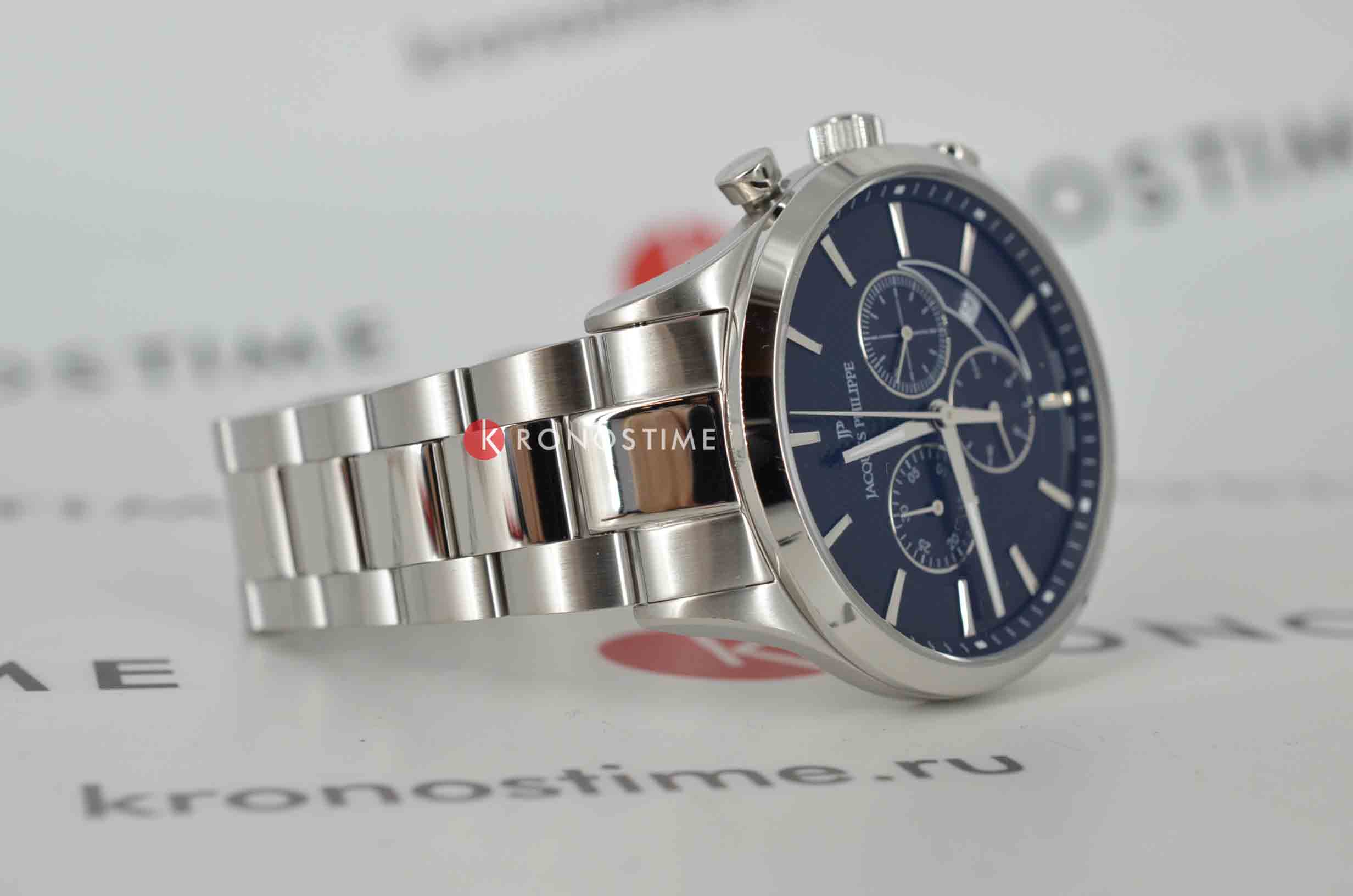 Швейцарские мужские часы-хронографХронографФункция позволяет измерять отрезки времени с особой точностью: часы, минуты, секунды. Верным признаком хронографа является наличие на циферблате 3 дополнительных окошек-счётчиков. Jacques Philippe Gallant JPQGC031316N, кварцевый механизм с высокой точностью. Сапфировое стеклоСапфировое стеклоПрочный и надёжный материал из кристалла сапфира синтетического происхождения, характеризующийся особой твёрдостью и устойчивостью к царапинам и повреждениям. устойчивое к появлению царапин, обладающее высокой прозрачностью. Корпус часов изготовлен из нержавеющей стали. На циферблате три дополнительных индикатора. Стрелки с люминесцентным покрытиемЛюминесцентное покрытиеПозволяет считывать показания времени в темноте. Производители наносят на стрелки, часовые индексы, безель или поверхность циферблата светонакопительный состав, дающий холодное свечение.. Окошко даты находится между 4 и 5 часами. Класс водозащиты: 50 метров, позволит защитить корпус от случайных брызг или капель дождя. Стальной браслет на застёжке «бабочка» с кнопкамиЗастёжка "бабочка"Такой вид застёжки дополняется предохранителями, помогающими избежать случайного раскрытия браслета. Обладают изящным исполнением. .