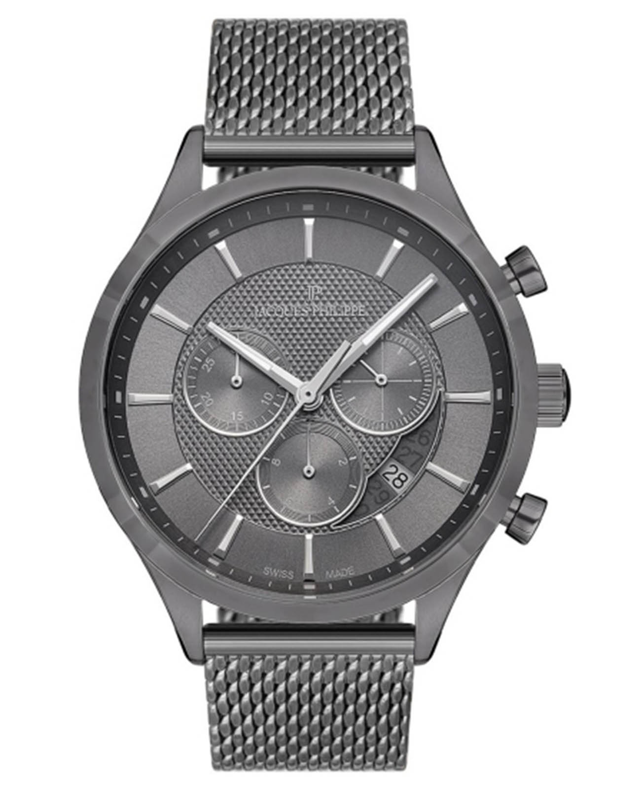 Швейцарские мужские часы-хронографХронографФункция позволяет измерять отрезки времени с особой точностью: часы, минуты, секунды. Верным признаком хронографа является наличие на циферблате 3 дополнительных окошек-счётчиков. Jacques Philippe Gallant JPQGC038247, кварцевый механизм с высокой точностью. Сапфировое стеклоСапфировое стеклоПрочный и надёжный материал из кристалла сапфира синтетического происхождения, характеризующийся особой твёрдостью и устойчивостью к царапинам и повреждениям. устойчивое к появлению царапин, обладающее высокой прозрачностью. Корпус часов изготовлен из стали с IP-покрытиемIP-покрытиеМетод ионного напыления. Демонстрирует повышенную устойчивость к истиранию, окислению и химическим веществам. Под воздействием высокого давления и температуры около 1500°C молекулы металла надёжно соединяются с частицами корпуса часов.. На циферблате три дополнительных индикатора. Стрелки с люминесцентным покрытиемЛюминесцентное покрытиеПозволяет считывать показания времени в темноте. Производители наносят на стрелки, часовые индексы, безель или поверхность циферблата светонакопительный состав, дающий холодное свечение.. Окошко даты находится между 4 и 5 часами. Класс водозащиты: 50 метров, позволит защитить корпус от случайных брызг или капель дождя. Стальной браслет миланского плетения с IP-покрытиемIP-покрытиеМетод ионного напыления. Демонстрирует повышенную устойчивость к истиранию, окислению и химическим веществам. Под воздействием высокого давления и температуры около 1500°C молекулы металла надёжно соединяются с частицами корпуса часов. на раскладном замкеРаскладной замокДанный вариант застежки используется только на часах с металлическим браслетом. Отличительная особенность такого крепления в том, что длина браслета становится универсальной и вы можете самостоятельно отрегулировать нужный вам размер – застежка просто двигается по браслету часов..