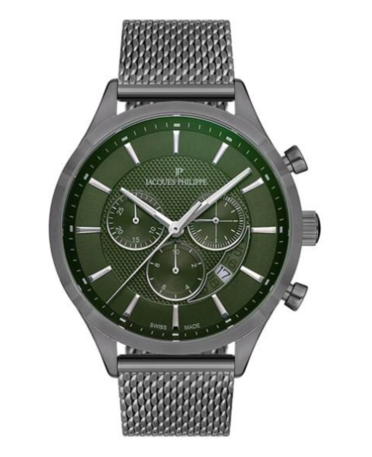 Швейцарские мужские часы-хронографХронографФункция позволяет измерять отрезки времени с особой точностью: часы, минуты, секунды. Верным признаком хронографа является наличие на циферблате 3 дополнительных окошек-счётчиков. Jacques Philippe Gallant JPQGC0382X7, кварцевый механизм с высокой точностью. Сапфировое стеклоСапфировое стеклоПрочный и надёжный материал из кристалла сапфира синтетического происхождения, характеризующийся особой твёрдостью и устойчивостью к царапинам и повреждениям. устойчивое к появлению царапин, обладающее высокой прозрачностью. Корпус часов изготовлен из стали с IP-покрытиемIP-покрытиеМетод ионного напыления. Демонстрирует повышенную устойчивость к истиранию, окислению и химическим веществам. Под воздействием высокого давления и температуры около 1500°C молекулы металла надёжно соединяются с частицами корпуса часов.. На циферблате три дополнительных индикатора. Стрелки с люминесцентным покрытиемЛюминесцентное покрытиеПозволяет считывать показания времени в темноте. Производители наносят на стрелки, часовые индексы, безель или поверхность циферблата светонакопительный состав, дающий холодное свечение.. Окошко даты находится между 4 и 5 часами. Класс водозащиты: 50 метров, позволит защитить корпус от случайных брызг или капель дождя. Стальной браслет миланского плетения с IP-покрытиемIP-покрытиеМетод ионного напыления. Демонстрирует повышенную устойчивость к истиранию, окислению и химическим веществам. Под воздействием высокого давления и температуры около 1500°C молекулы металла надёжно соединяются с частицами корпуса часов. на раскладном замкеРаскладной замокДанный вариант застежки используется только на часах с металлическим браслетом. Отличительная особенность такого крепления в том, что длина браслета становится универсальной и вы можете самостоятельно отрегулировать нужный вам размер – застежка просто двигается по браслету часов..