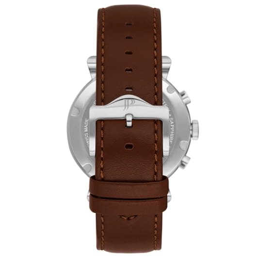 Швейцарские мужские часы-хронографХронографФункция позволяет измерять отрезки времени с особой точностью: часы, минуты, секунды. Верным признаком хронографа является наличие на циферблате 3 дополнительных окошек-счётчиков. с секундомеромСекундомерСекундоме́р — прибор, способный измерять интервалы времени с точностью до долей секунды. Jacques Philippe Vintage JPQGC191121, кварцевый механизм с высокой точностью. Сапфировое стеклоСапфировое стеклоПрочный и надёжный материал из кристалла сапфира синтетического происхождения, характеризующийся особой твёрдостью и устойчивостью к царапинам и повреждениям. устойчивое к появлению царапин, обладающее высокой прозрачностью. Корпус часов изготовлен из нержавеющей стали. На циферблате три дополнительных индикатора. Окошко даты находится между 4 и 5 часами. Класс водозащиты: 50 метров, позволит защитить корпус от случайных брызг или капель дождя. Кожаный ремешок на стандартной застёжке.