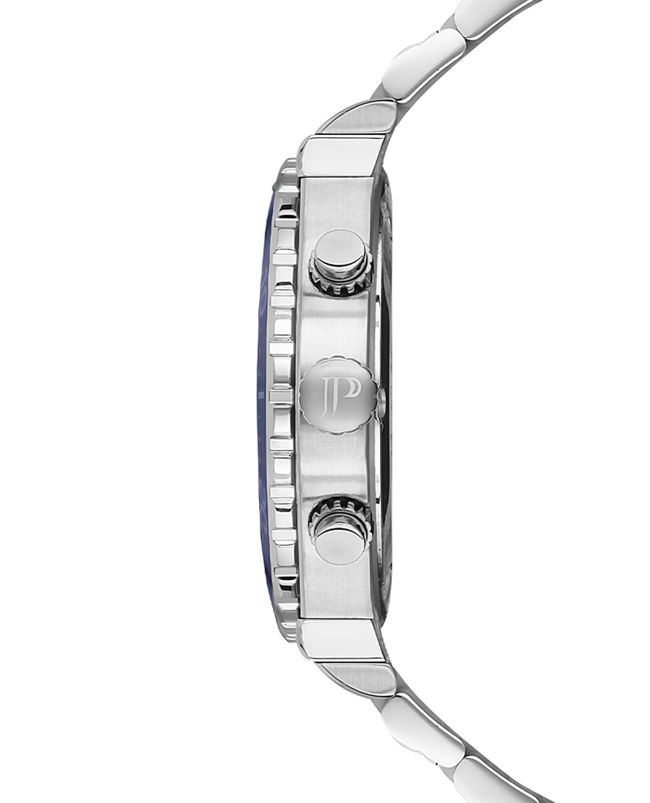 Швейцарские мужские часы-хронографХронографФункция позволяет измерять отрезки времени с особой точностью: часы, минуты, секунды. Верным признаком хронографа является наличие на циферблате 3 дополнительных окошек-счётчиков. с секундомеромСекундомерСекундоме́р — прибор, способный измерять интервалы времени с точностью до долей секунды. Jacques Philippe Cavalier JPQGC201336, кварцевый механизм с высокой точностью. Сапфировое стеклоСапфировое стеклоПрочный и надёжный материал из кристалла сапфира синтетического происхождения, характеризующийся особой твёрдостью и устойчивостью к царапинам и повреждениям. устойчивое к появлению царапин, обладающее высокой прозрачностью. Корпус часов изготовлен из нержавеющей стали. БезельБезельВнешний ободок, закрепляющий стекло. В спортивных часах так называется поворотное кольцо с делениями на циферблате, выполняет роль таймера – замеряет отрезки времени на шкале. Неподвижный безель – элемент декора. Однонаправленно вращающийся безель на дайверских часах позволяет фиксировать моменты погружения и выныривания на поверхность. из стали с IP-покрытиемIP-покрытиеМетод ионного напыления. Демонстрирует повышенную устойчивость к истиранию, окислению и химическим веществам. Под воздействием высокого давления и температуры около 1500°C молекулы металла надёжно соединяются с частицами корпуса часов.. На циферблате три дополнительных индикатора. Окошко даты находится в положении 6 часов. Стрелки с люминесцентным покрытиемЛюминесцентное покрытиеПозволяет считывать показания времени в темноте. Производители наносят на стрелки, часовые индексы, безель или поверхность циферблата светонакопительный состав, дающий холодное свечение.. Класс водозащиты: 50 метров, позволит защитить корпус от случайных брызг или капель дождя. Стальной браслет на застёжке «бабочка» с кнопкамиЗастёжка "бабочка"Такой вид застёжки дополняется предохранителями, помогающими избежать случайного раскрытия браслета. Обладают изящным исполнением. .