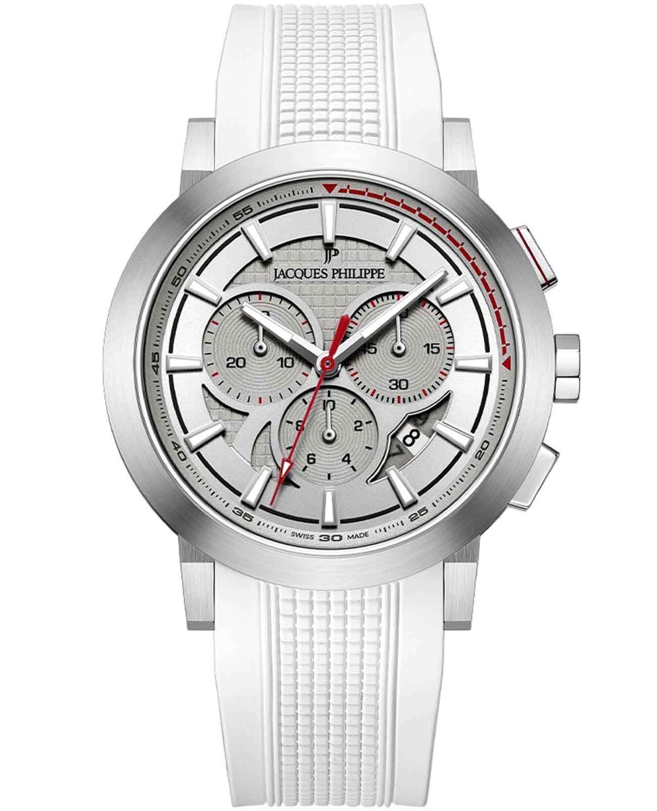 Jacques Philippe Corus JPQGC371440 — стильные швейцарские часы с функцией хронографаХронографФункция позволяет измерять отрезки времени с особой точностью: часы, минуты, секунды. Верным признаком хронографа является наличие на циферблате 3 дополнительных окошек-счётчиков. и секундомераСекундомерСекундоме́р — прибор, способный измерять интервалы времени с точностью до долей секунды., которые сочетают в себе элегантность и современный функционал. Модель оснащена точным кварцевым механизмом и надежным корпусом из нержавеющей стали 316L, что гарантирует долговечность и устойчивость к механическим воздействиям. Сапфировое стеклоСапфировое стеклоПрочный и надёжный материал из кристалла сапфира синтетического происхождения, характеризующийся особой твёрдостью и устойчивостью к царапинам и повреждениям. отличается высокой прозрачностью и устойчивостью к царапинам, сохраняя безупречный внешний вид часов даже при активном использовании. Серебристый циферблат украшен тремя дополнительными индикаторами и удобным окошком даты в положении «4 часа», а стрелки с люминесцентным покрытиемЛюминесцентное покрытиеПозволяет считывать показания времени в темноте. Производители наносят на стрелки, часовые индексы, безель или поверхность циферблата светонакопительный состав, дающий холодное свечение. обеспечивают отличную читаемость в любое время суток. Силиконовый белый ремешок обеспечивает комфортное прилегание и хорошо подходит для повседневной носки. Класс водозащиты 5 ATM (50 метров) позволяет не снимать часы во время мытья рук или прогулок под дождем.