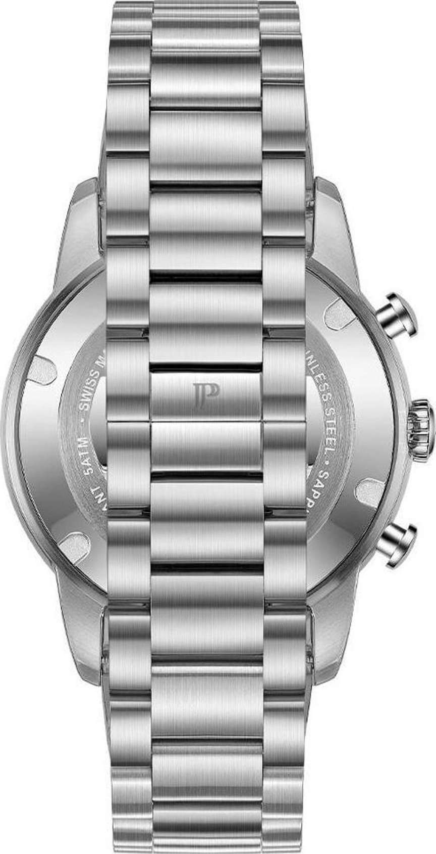 Швейцарские наручные часы Jacques Philippe JPQGC6913X6 сочетают в себе современный дизайн, надежность и функциональность, это стильные швейцарские часы с функцией хронографаХронографФункция позволяет измерять отрезки времени с особой точностью: часы, минуты, секунды. Верным признаком хронографа является наличие на циферблате 3 дополнительных окошек-счётчиков. и секундомераСекундомерСекундоме́р — прибор, способный измерять интервалы времени с точностью до долей секунды.. Корпус круглой формы диаметром 42 мм выполнен из прочной нержавеющей стали, а безельБезельВнешний ободок, закрепляющий стекло. В спортивных часах так называется поворотное кольцо с делениями на циферблате, выполняет роль таймера – замеряет отрезки времени на шкале. Неподвижный безель – элемент декора. Однонаправленно вращающийся безель на дайверских часах позволяет фиксировать моменты погружения и выныривания на поверхность. с элегантным зеленым IP-покрытиемIP-покрытиеМетод ионного напыления. Демонстрирует повышенную устойчивость к истиранию, окислению и химическим веществам. Под воздействием высокого давления и температуры около 1500°C молекулы металла надёжно соединяются с частицами корпуса часов.. Сапфировое стеклоСапфировое стеклоПрочный и надёжный материал из кристалла сапфира синтетического происхождения, характеризующийся особой твёрдостью и устойчивостью к царапинам и повреждениям. с антибликовым покрытиемАнтибликовое покрытиеСлой оксида металла в 0,13-0,3 микрон, благодаря которому стекло часов не бликует и не отражает свет. Антибликовое покрытие уменьшает отражение света в 10 раз, обеспечивая отличную читаемость показателей циферблата. надежно защищает зеленый циферблат от царапин и повреждений. Модель оснащена точным кварцевым механизмом, а также дополнительными функциями — тахиметромТахиметрРазмеченная шкала, располагается на ободке или безеле часов. Тахиметр позволяет рассчитать скорость на определённом участке пути, расстояние измеряется в километрах или милях. и индикатором даты, что делает часы не только стильным аксессуаром, но и практичным помощником на каждый день. Серебряный браслет шириной 22 мм удобно фиксируется на запястье с помощью застежки «бабочка»Застёжка "бабочка"Такой вид застёжки дополняется предохранителями, помогающими избежать случайного раскрытия браслета. Обладают изящным исполнением. . Стрелки имеют люминесцентное покрытиеЛюминесцентное покрытиеПозволяет считывать показания времени в темноте. Производители наносят на стрелки, часовые индексы, безель или поверхность циферблата светонакопительный состав, дающий холодное свечение. для удобства чтения времени в темноте. Водозащита 5 АТМ позволяет не снимать часы при дожде и случайных контактах с водой.