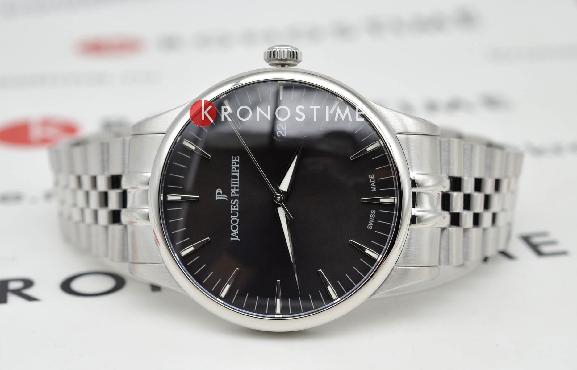Jacques Philippe JPQGS661316 — стильные мужские часы в классическом формате с акцентом на надёжность и элегантность. Корпус круглой формы диаметром 40 мм из нержавеющей стали отличается утонченным силуэтом при толщине примерно 12 мм, обеспечивая комфорт при длительном ношении . Циферблат чёрного цвета оформлен лаконично: тонкие стрелки и минималистичные часовые метки подчёркивают строгий характер модели. Встроенная функция отображения даты придаёт часы практичность без лишнего визуального нагромождения. Поверхность защищает сапфировое стеклоСапфировое стеклоПрочный и надёжный материал из кристалла сапфира синтетического происхождения, характеризующийся особой твёрдостью и устойчивостью к царапинам и повреждениям. — устойчивое к царапинам и бликам . Внутри используется точный швейцарский кварцевый механизм, не требующий подзавода и сохраняющий стабильную работу без сложного обслуживания . Модель оснащена металлическим браслетом из нержавеющей стали в оттенке металлик‑серый, ширина звеньев около 22 мм, что обеспечивает надёжную посадку и солидный внешний вид . Водозащита составляет до 5 ATM, — часы без проблем выдерживают случайный контакт с водой в повседневной эксплуатации . Jacques Philippe — гармоничное сочетание классического стиля, точного швейцарского кварца и практичности в одном надёжном аксессуаре.