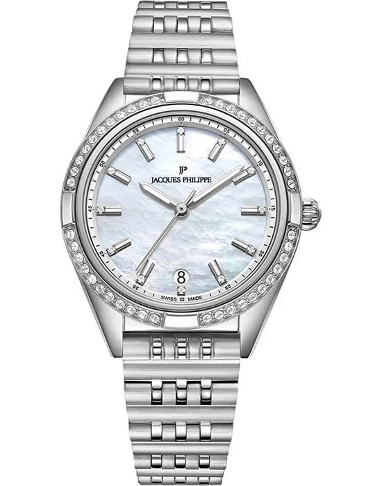 Jacques Philippe Radiante JPQLS681386 — изящная женская модель коллекции Radiante с кварцевым механизмом, сочетающая классический стиль и практичность. Корпус диаметром 33 мм выполнен из нержавеющей стали и полированными поверхностями, безельБезельВнешний ободок, закрепляющий стекло. В спортивных часах так называется поворотное кольцо с делениями на циферблате, выполняет роль таймера – замеряет отрезки времени на шкале. Неподвижный безель – элемент декора. Однонаправленно вращающийся безель на дайверских часах позволяет фиксировать моменты погружения и выныривания на поверхность. инкрустирован кристаллами, что придаёт часам утончённый блеск. Водозащита до 5 атм (50 м) позволяет носить модель в повседневных условиях. Выпуклое сапфировое стеклоСапфировое стеклоПрочный и надёжный материал из кристалла сапфира синтетического происхождения, характеризующийся особой твёрдостью и устойчивостью к царапинам и повреждениям. обеспечивает защиту от царапин и сохраняет высокую прозрачность, делая циферблат легко читаемым. Модель оснащена точным швейцарским кварцевым механизмом с индикацией часов, минут и секунд. Циферблат оформлен в лаконичном стиле с аккуратными метками, а браслет из нержавеющей стали гармонично завершает образ, подчёркивая универсальность и элегантность этих часов.