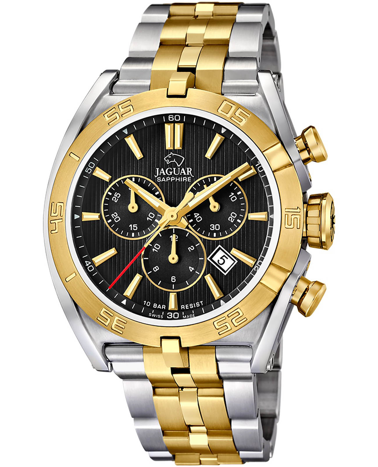 Мужские швейцарские часы-хронографХронографФункция позволяет измерять отрезки времени с особой точностью: часы, минуты, секунды. Верным признаком хронографа является наличие на циферблате 3 дополнительных окошек-счётчиков. Jaguar Executive J855/C. Кварцевый швейцарский калибр Ronda 5030d. Сапфировое стеклоСапфировое стеклоПрочный и надёжный материал из кристалла сапфира синтетического происхождения, характеризующийся особой твёрдостью и устойчивостью к царапинам и повреждениям. устойчивое к мелким механическим повреждениям. Корпус и браслет часов изготовлены из нержавеющей стали. Стрелки и метки с люминесцентным покрытиемЛюминесцентное покрытиеПозволяет считывать показания времени в темноте. Производители наносят на стрелки, часовые индексы, безель или поверхность циферблата светонакопительный состав, дающий холодное свечение.. Окошко даты находится в положении между «4» и «5 часами». Класс водозащиты: 100 метров, позволит плавать, нырять и заниматься другими водными видами спорта. Стальной браслет с частичным PVD-покрытиемPVDУльтратонкое покрытие наносится в технике вакуумного напыления, сочетает в себе нитрид титана особой прочности со слоем золота или оксида хрома. Несёт в себе декоративную или защитную функцию. на раскладной застёжкеРаскладная застёжкаТакой тип застёжки используется только на браслетах из металла. Она никогда не раскрывается полностью, происходит разделение на 2 и более частей. Раскладывающая застёжка снизит вероятность потери часов к минимуму.. БезельБезельВнешний ободок, закрепляющий стекло. В спортивных часах так называется поворотное кольцо с делениями на циферблате, выполняет роль таймера – замеряет отрезки времени на шкале. Неподвижный безель – элемент декора. Однонаправленно вращающийся безель на дайверских часах позволяет фиксировать моменты погружения и выныривания на поверхность. с PVD-покрытиемPVDУльтратонкое покрытие наносится в технике вакуумного напыления, сочетает в себе нитрид титана особой прочности со слоем золота или оксида хрома. Несёт в себе декоративную или защитную функцию..