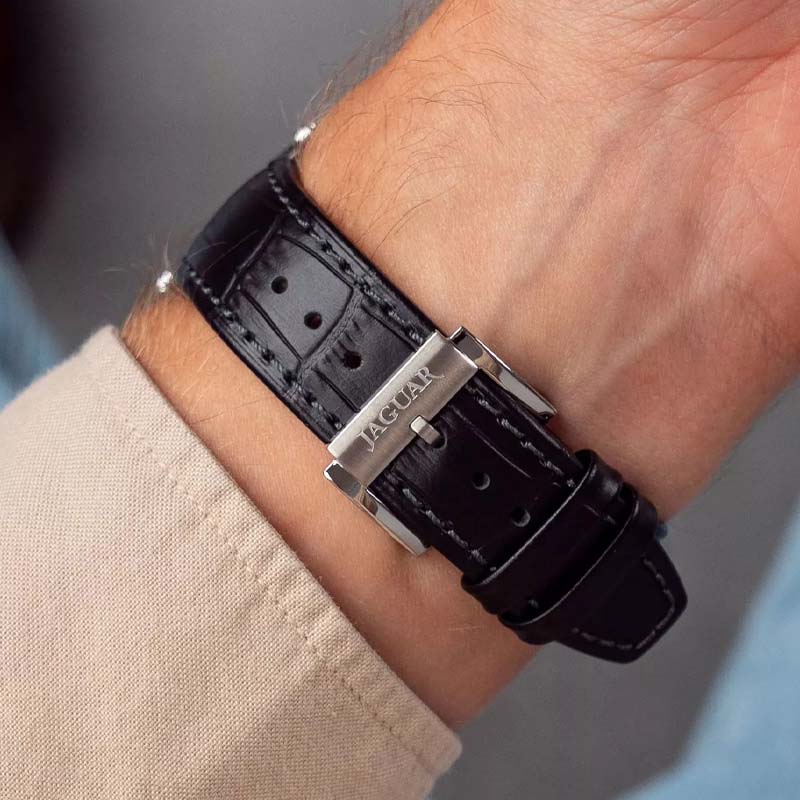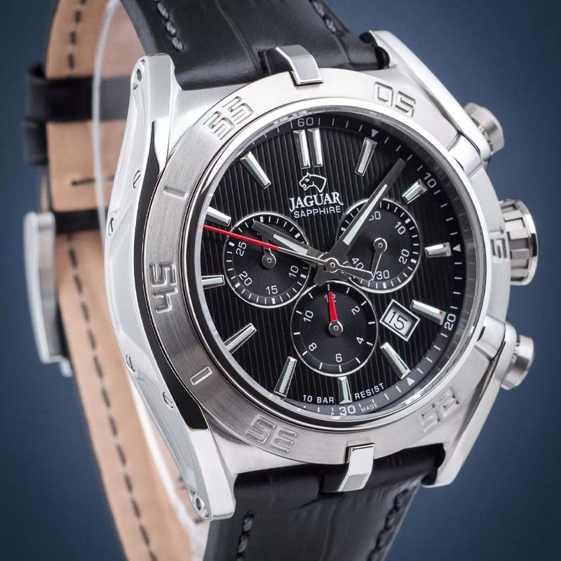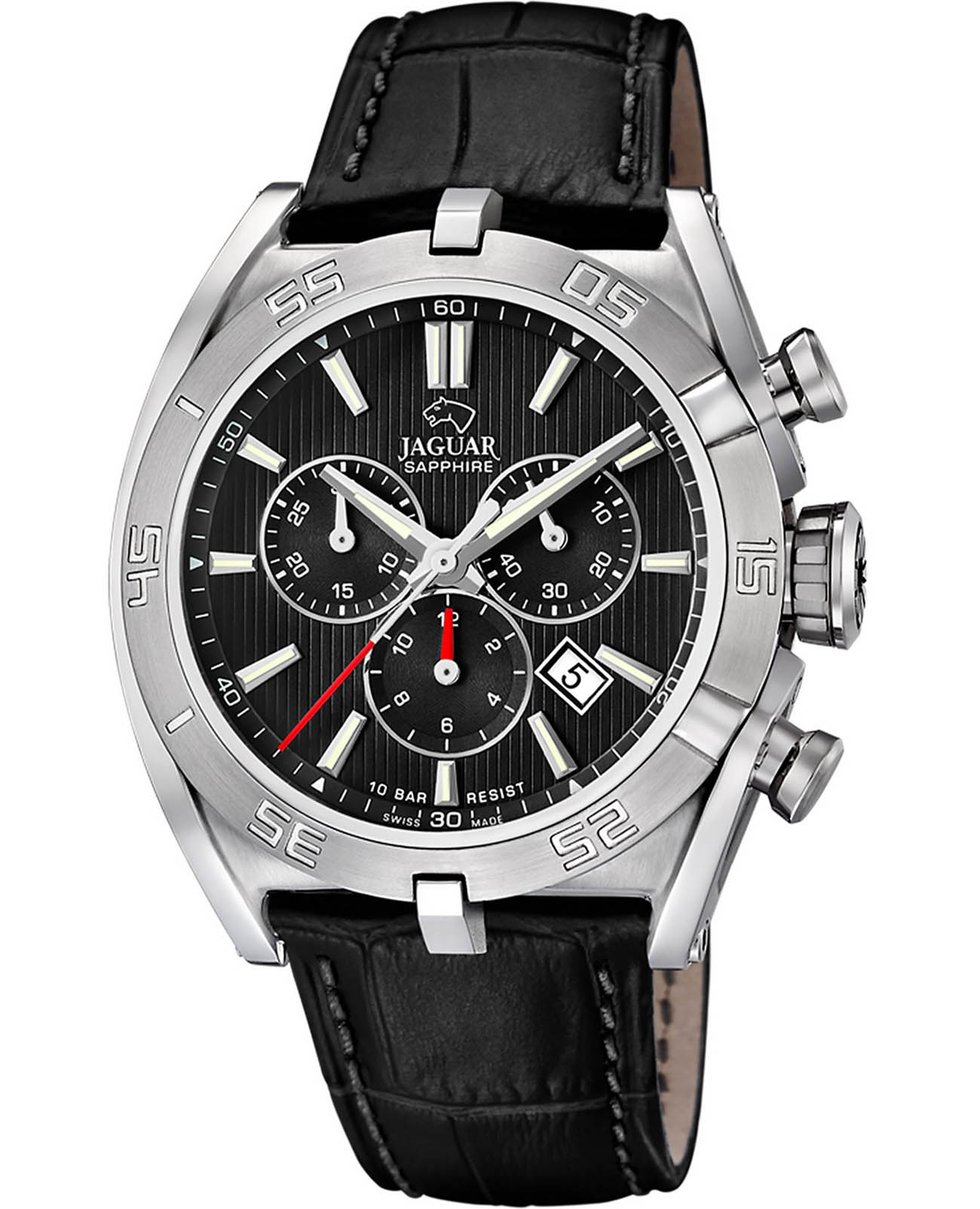 Мужские швейцарские часы-хронографХронографФункция позволяет измерять отрезки времени с особой точностью: часы, минуты, секунды. Верным признаком хронографа является наличие на циферблате 3 дополнительных окошек-счётчиков. Jaguar Executive Chrono J857/D. Кварцевый швейцарский калибр Ronda 5030d. Сапфировое стеклоСапфировое стеклоПрочный и надёжный материал из кристалла сапфира синтетического происхождения, характеризующийся особой твёрдостью и устойчивостью к царапинам и повреждениям. устойчивое к мелким механическим повреждениям. Корпус и браслет часов изготовлены из нержавеющей стали. Стрелки и метки с люминесцентным покрытиемЛюминесцентное покрытиеПозволяет считывать показания времени в темноте. Производители наносят на стрелки, часовые индексы, безель или поверхность циферблата светонакопительный состав, дающий холодное свечение.. Окошко даты находится в положении между «4» и «5 часами». Класс водозащиты: 100 метров, позволит плавать, нырять и заниматься другими водными видами спорта. Кожаный ремешок на стандартной застёжке.