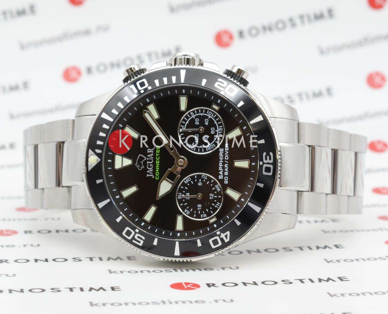 Браслет с раскладывающейся застёжкой обеспечивает удобство при ношении. БезельБезельВнешний ободок, закрепляющий стекло. В спортивных часах так называется поворотное кольцо с делениями на циферблате, выполняет роль таймера – замеряет отрезки времени на шкале. Неподвижный безель – элемент декора. Однонаправленно вращающийся безель на дайверских часах позволяет фиксировать моменты погружения и выныривания на поверхность. с PVD-покрытиемPVDУльтратонкое покрытие наносится в технике вакуумного напыления, сочетает в себе нитрид титана особой прочности со слоем золота или оксида хрома. Несёт в себе декоративную или защитную функцию., придающим часам стильный вид. Гибридный механизм швейцарского производства обеспечивает точность хода, а смарт-модуль позволяет подключать часы к телефону через Bluetooth и управлять функциями через приложение Jaguar.