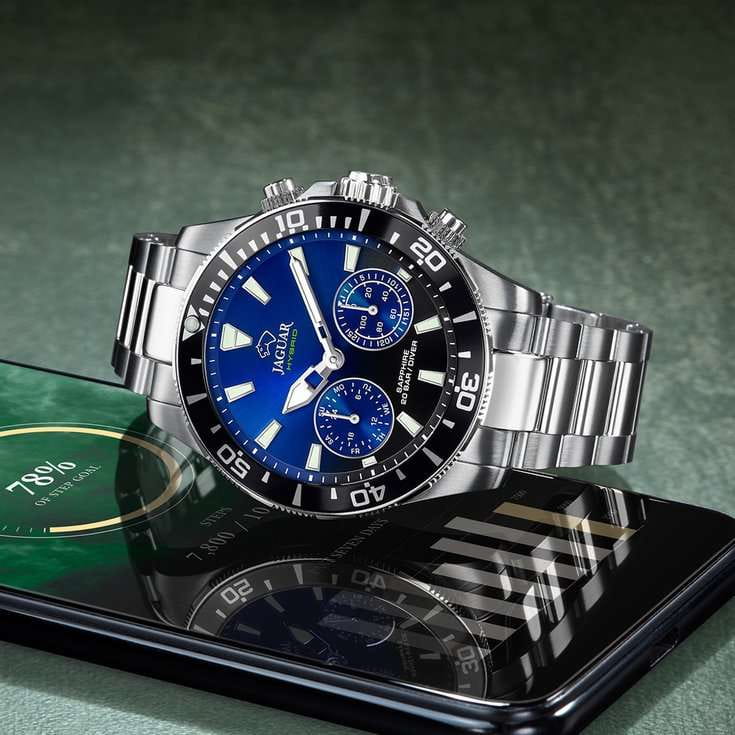 Мужские швейцарские часы Jaguar Connected J888/6. Сапфировое стеклоСапфировое стеклоПрочный и надёжный материал из кристалла сапфира синтетического происхождения, характеризующийся особой твёрдостью и устойчивостью к царапинам и повреждениям. устойчивое к мелким механическим повреждениям. Корпус и браслет часов изготовлены из нержавеющей стали. Стрелки и метки с люминесцентным покрытиемЛюминесцентное покрытиеПозволяет считывать показания времени в темноте. Производители наносят на стрелки, часовые индексы, безель или поверхность циферблата светонакопительный состав, дающий холодное свечение.. Календарь находится в положении 8 часов. Класс водозащиты: 200 метров, позволит плавать, нырять и заниматься другими водными видами спорта. Стальной браслет на раскладной застёжкеРаскладная застёжкаТакой тип застёжки используется только на браслетах из металла. Она никогда не раскрывается полностью, происходит разделение на 2 и более частей. Раскладывающая застёжка снизит вероятность потери часов к минимуму.. БезельБезельВнешний ободок, закрепляющий стекло. В спортивных часах так называется поворотное кольцо с делениями на циферблате, выполняет роль таймера – замеряет отрезки времени на шкале. Неподвижный безель – элемент декора. Однонаправленно вращающийся безель на дайверских часах позволяет фиксировать моменты погружения и выныривания на поверхность. с PVD-покрытиемPVDУльтратонкое покрытие наносится в технике вакуумного напыления, сочетает в себе нитрид титана особой прочности со слоем золота или оксида хрома. Несёт в себе декоративную или защитную функцию.. За точный ход работы часов, из коллекции Connected, отвечает кварцевый гибридный механизм швейцарского производства со Смарт-Модулем. Данный тип механизма обеспечивает возможность подключить часы к телефону через Bluetooth и управлять большим рядом дополнительных функций на выбор с помошью приложения Jaguar. Дополнительные функции: отображение даты и дня недели, секундомер, таймер, GMT, шагомер, поиск телефона, включение/выключение звука телефона при входящих вызовах, переключение музыки, вибро-уведомления.