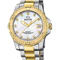 Женские швейцарские часы Jaguar Couple Diver J970/4. Кварцевый швейцарский калибр Ronda 6003.d. Сапфировое стеклоСапфировое стеклоПрочный и надёжный материал из кристалла сапфира синтетического происхождения, характеризующийся особой твёрдостью и устойчивостью к царапинам и повреждениям. устойчивое к мелким механическим повреждениям. Корпус часов изготовлен из нержавеющей стали. Циферблат декорирован вставками из циркония на метках времени. Стрелки и метки с люминесцентным покрытиемЛюминесцентное покрытиеПозволяет считывать показания времени в темноте. Производители наносят на стрелки, часовые индексы, безель или поверхность циферблата светонакопительный состав, дающий холодное свечение.. Окошко даты находится в положении 3 часа. Класс водозащиты: 200 метров, позволит плавать, нырять и заниматься другими водными видами спорта. Стальной браслет с частичным PVD-покрытиемPVDУльтратонкое покрытие наносится в технике вакуумного напыления, сочетает в себе нитрид титана особой прочности со слоем золота или оксида хрома. Несёт в себе декоративную или защитную функцию. на раскладной застёжкеРаскладная застёжкаТакой тип застёжки используется только на браслетах из металла. Она никогда не раскрывается полностью, происходит разделение на 2 и более частей. Раскладывающая застёжка снизит вероятность потери часов к минимуму.. БезельБезельВнешний ободок, закрепляющий стекло. В спортивных часах так называется поворотное кольцо с делениями на циферблате, выполняет роль таймера – замеряет отрезки времени на шкале. Неподвижный безель – элемент декора. Однонаправленно вращающийся безель на дайверских часах позволяет фиксировать моменты погружения и выныривания на поверхность. с PVD-покрытиемPVDУльтратонкое покрытие наносится в технике вакуумного напыления, сочетает в себе нитрид титана особой прочности со слоем золота или оксида хрома. Несёт в себе декоративную или защитную функцию..
