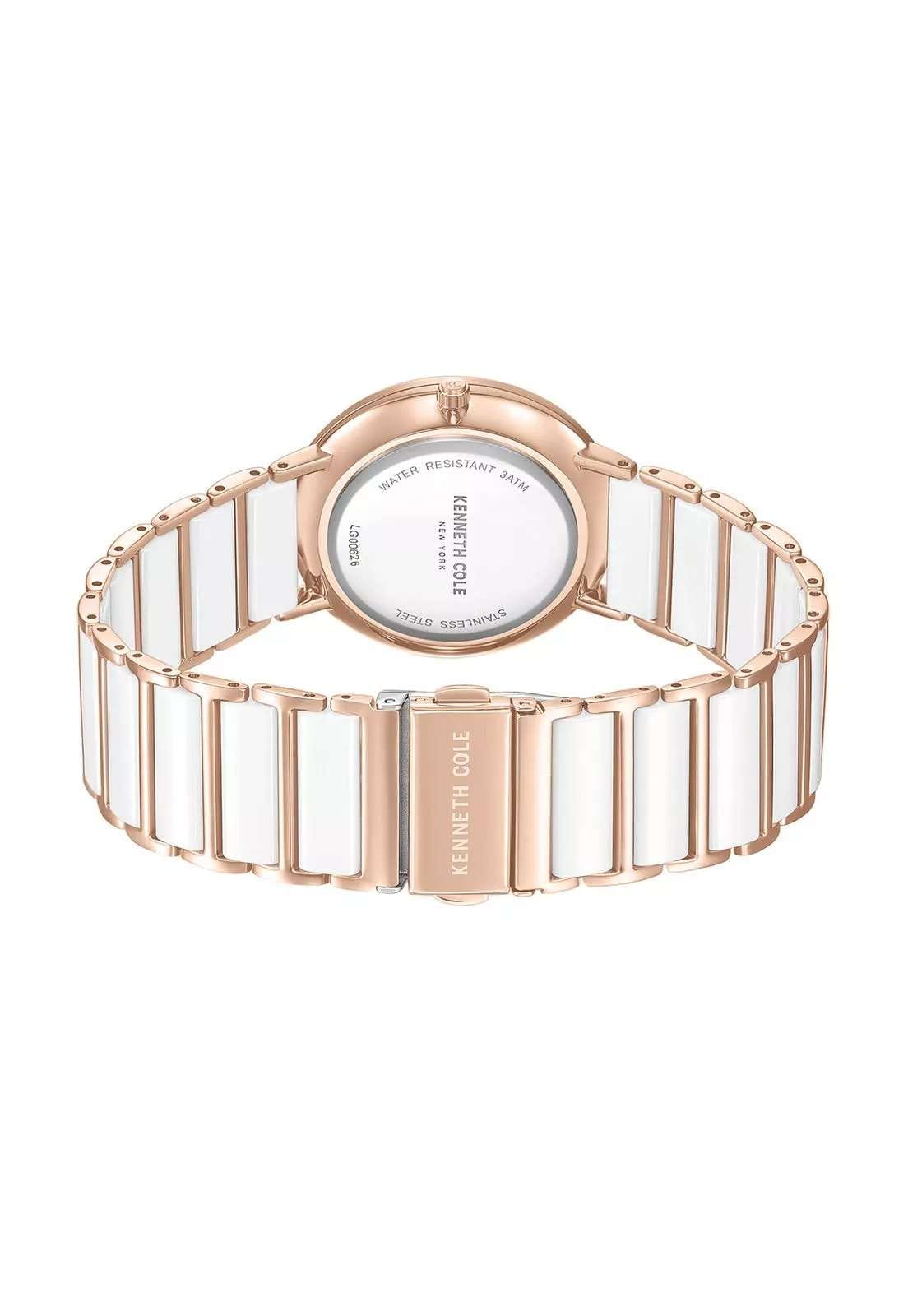 Женские кварцевые часы Kenneth Cole — это элегантный и выразительный аксессуар. Корпус диаметром 36 мм выполнен из нержавеющей стали 316L с IP-покрытиемIP-покрытиеМетод ионного напыления. Демонстрирует повышенную устойчивость к истиранию, окислению и химическим веществам. Под воздействием высокого давления и температуры около 1500°C молекулы металла надёжно соединяются с частицами корпуса часов. цвета розового золота. Циферблат белого цвета оформлен индексами и украшен цирконами. Циферблат защищён минеральным стекломМинеральное стеклоМинеральное стекло представляет собой искусственно выращенный минерал кварца. Такое стекло отличается особой устойчивостью к повреждениям и царапинам. Уступает по некоторым качествам сапфировому стеклу.. Часы оснащены браслетом из нержавеющей стали с IP-покрытиемIP-покрытиеМетод ионного напыления. Демонстрирует повышенную устойчивость к истиранию, окислению и химическим веществам. Под воздействием высокого давления и температуры около 1500°C молекулы металла надёжно соединяются с частицами корпуса часов. и вставками из высокотехнологичной керамикиВысокотехнологичная керамикаИнновационный запатентованный Rado материал с гладкой или матовой поверхностью. Керамика за счёт кристаллической структуры обладает повышенной устойчивостью от возникновения царапин. Материал способен принимать температуру тела человека, обеспечивая невероятный комфорт при ношении. на раскладной застёжкеРаскладная застёжкаТакой тип застёжки используется только на браслетах из металла. Она никогда не раскрывается полностью, происходит разделение на 2 и более частей. Раскладывающая застёжка снизит вероятность потери часов к минимуму.. Водонепроницаемость 30 м позволяет использовать часы в повседневных условиях. Идеальный выбор для тех, кто ценит стиль, блеск и американское качество.