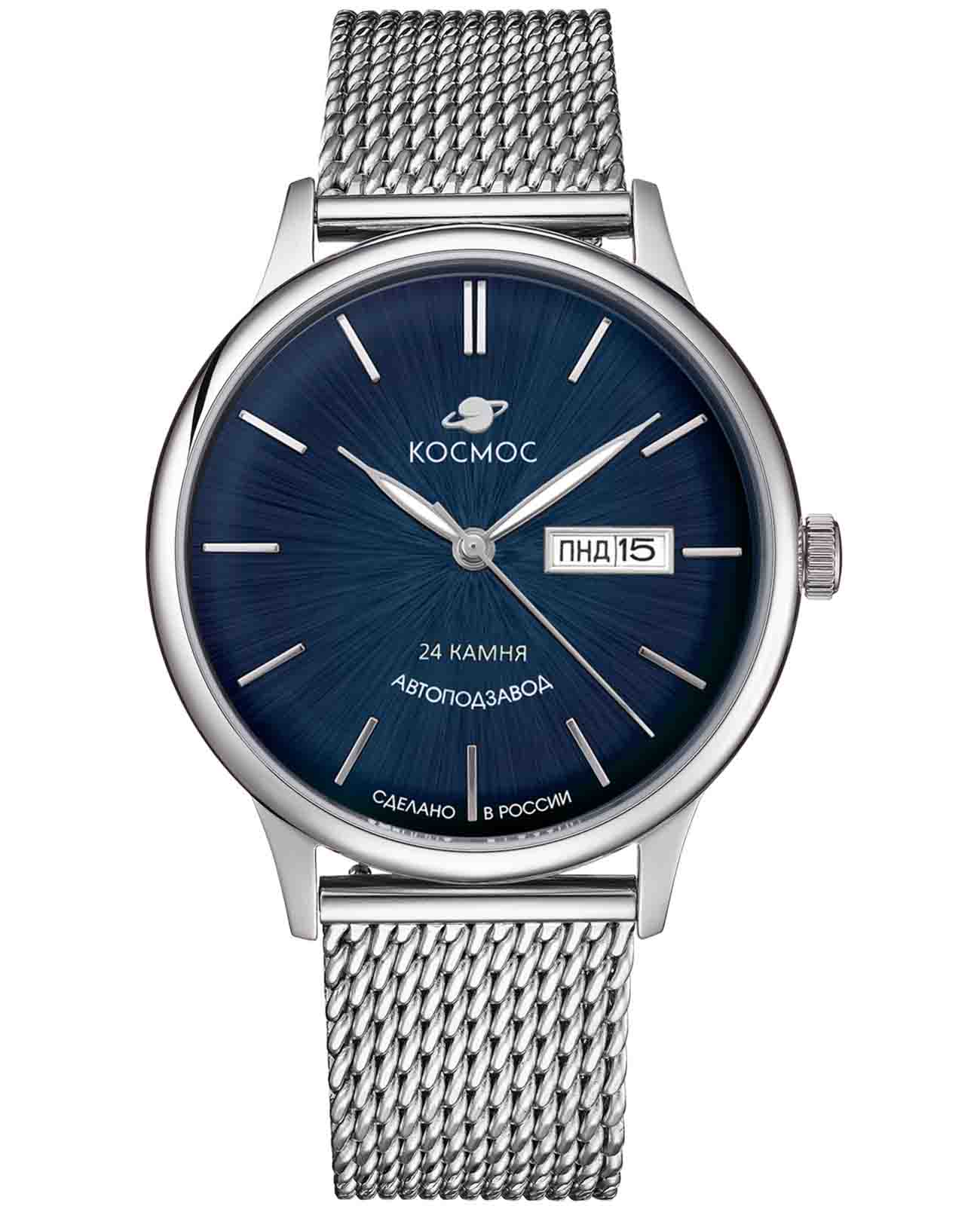 Российские мужские механические часы Космос K 043.10.36 с автоподзаводом оснащены корпусом из нержавеющей стали 316L диаметром 41 мм и защищены минеральным стекломМинеральное стеклоМинеральное стекло представляет собой искусственно выращенный минерал кварца. Такое стекло отличается особой устойчивостью к повреждениям и царапинам. Уступает по некоторым качествам сапфировому стеклу.. Дополнен функциями отображения даты и дня недели. Заводная головка декорирована логотипом бренда в виде стилизованного изображения планеты. Часы имеют водонепроницаемость 50 метров, позволит защитить корпус от случайных брызг или капель дождя. Модель комплектуется браслетом из нержавеющей стали 316L с миланским плетением на раскладном замкеРаскладной замокДанный вариант застежки используется только на часах с металлическим браслетом. Отличительная особенность такого крепления в том, что длина браслета становится универсальной и вы можете самостоятельно отрегулировать нужный вам размер – застежка просто двигается по браслету часов.. Специальные крепежи позволяют легко заменить браслет на часах самостоятельно. Прочный корпус и надежный механизм делают эти часы универсальным аксессуаром для повседневного использования. Уникальный дизайн и высокое качество материалов подчеркивают индивидуальность владельца.