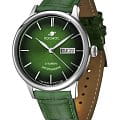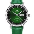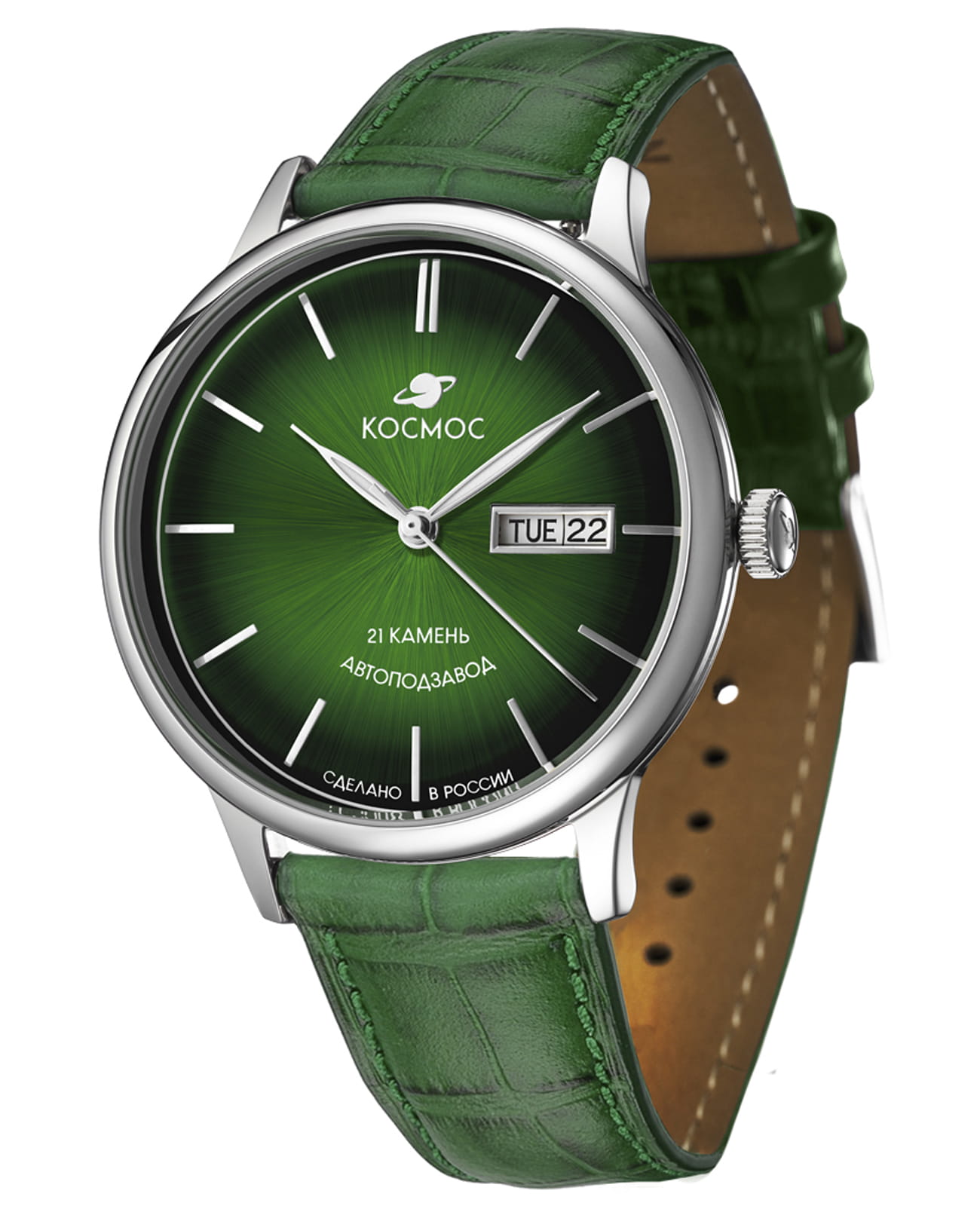 Мужские наручные часы Космос Юпитер K 043.17.38 — это сочетание традиций часового искусства 60-70-х годов и футуристического дизайна, вдохновленного космическими исследованиями. Они не только служат напоминанием о прошлом, но и побуждают задуматься о будущем, позволяя наслаждаться качеством и смыслом, вложенными в каждую деталь. Полированный корпус часов выполнен в виде силуэта летающей тарелки благодаря выпуклым формам стекла и нижней части корпуса. Стальные ушки, которые напоминают опоры летающей тарелки, завершает общий образ. На задней крышке часов выгравирован фантазийный сюжет – космическая станция будущего. Внутри модели установлен японский механизм с автоподзаводом, работающий на 24 рубинах, что обеспечивает его точность. Зеленый циферблат, выполненный в ретро-стиле, имеет изогнутые края, что требует сложной технологии производства. Циферблаты такой формы создавали в часах прошлых лет. Кончик секундной стрелки выгнут по форме циферблата. На выпуклом градиентном циферблате выполнена шлифовка в стиле солнечных лучей и размещены изготовленные вручную индексы, которые крепятся на двух штифтах. В модели представлены дополнительные функции даты и дня недели. На часовую, минутную стрелки, и круг по краю циферблата, напоминающий ореол по краю Земли, нанесено люминесцентное покрытиеЛюминесцентное покрытиеПозволяет считывать показания времени в темноте. Производители наносят на стрелки, часовые индексы, безель или поверхность циферблата светонакопительный состав, дающий холодное свечение., которое светится в темноте, создавая необычное изображение. Минеральное стеклоМинеральное стеклоМинеральное стекло представляет собой искусственно выращенный минерал кварца. Такое стекло отличается особой устойчивостью к повреждениям и царапинам. Уступает по некоторым качествам сапфировому стеклу. часов тоже тщательно проработано: оно выпуклое как снаружи, так и изнутри, что предотвращает искажение изображений на циферблате. Ремешок со стандартной застежкой сделан из натуральной кожи зеленого цвета.