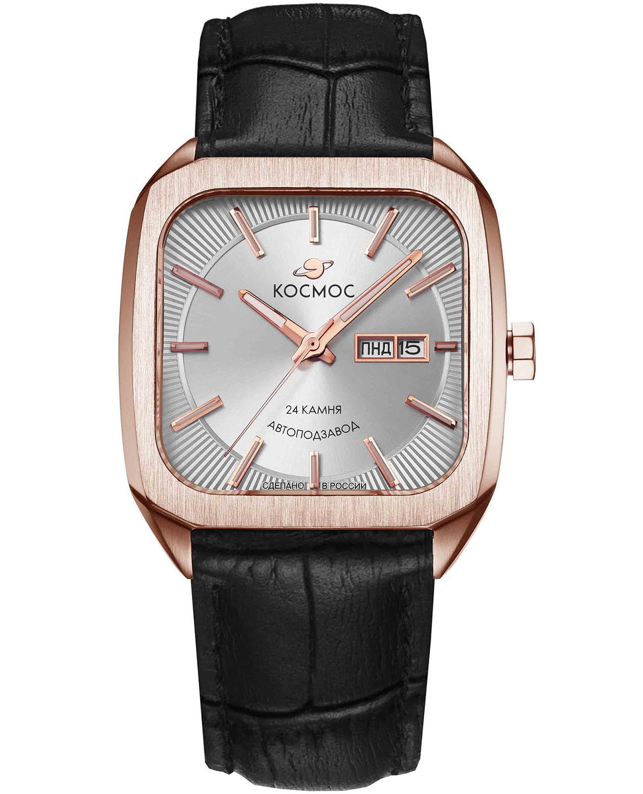 Мужские наручные часы Космос Марсоход K 213.41.33 — это уникальная лимитированная серия, посвященная аппарату, способному передвигаться по поверхности Красной планеты. Марсоход ассоциируется с брутальностью, мастерством и технической сложностью. Наша страна дважды запускала подобные аппараты еще в 70-х годах прошлого века. Дизайн часов серии Марсоход вдохновлен лучшими работами советских мастеров, сочетая современные технологии часового искусства с обаянием стиля ретро. Корпус в форме квадрата с закругленными углами выполнен из нержавеющей стали с PVDPVDУльтратонкое покрытие наносится в технике вакуумного напыления, сочетает в себе нитрид титана особой прочности со слоем золота или оксида хрома. Несёт в себе декоративную или защитную функцию. покрытием, украшенной зеркальной полировкой и сатинированием. Удобная заводная головка имеет форму гайки, что добавляет модели индустриальный шарм. Задняя крышка прозрачная, закрепленная на четырех винтах, и позволяет увидеть работу механизма TMI с подвижным ротором, на котором гравируется надпись «Сделано в России». Также здесь представлена гравировка с изображением космонавта, придающая часам особую значимость. Водостойкость достигает 10 атм (WR100), что позволяет использовать часы при плавании и других водных видах спорта. На задней крышке указан индивидуальный номер модели в формате от 01/50 до 50/50 (первый выпуск) или от 051/100 до 100/100 (второй выпуск). Объемный циферблат состоит из двух уровней. В центре движутся три стрелки, часовая и минутная из которых имеют люминесцентное покрытиеЛюминесцентное покрытиеПозволяет считывать показания времени в темноте. Производители наносят на стрелки, часовые индексы, безель или поверхность циферблата светонакопительный состав, дающий холодное свечение., позволяющее определять время даже в темноте. Индексы накладные, как и стальная рамка, выделяющая сдвоенное окошко даты и дня недели, где день недели отображается на двух языках — русском и английском. Циферблат защищен прочным сапфировым стеклом с антибликовым покрытиемСапфировое стеклоПрочный и надёжный материал из кристалла сапфира синтетического происхождения, характеризующийся особой твёрдостью и устойчивостью к царапинам и повреждениям., обеспечивающим отличную читаемость показаний в любых условиях. Кожаный ремешок оснащен удобной застёжкой «бабочка» с кнопкамиЗастёжка "бабочка"Такой вид застёжки дополняется предохранителями, помогающими избежать случайного раскрытия браслета. Обладают изящным исполнением. , которая сводит к минимуму вероятность потери. Коллекция Марсоход — идеальный выбор для ценителей истории космических достижений и современных технологий.