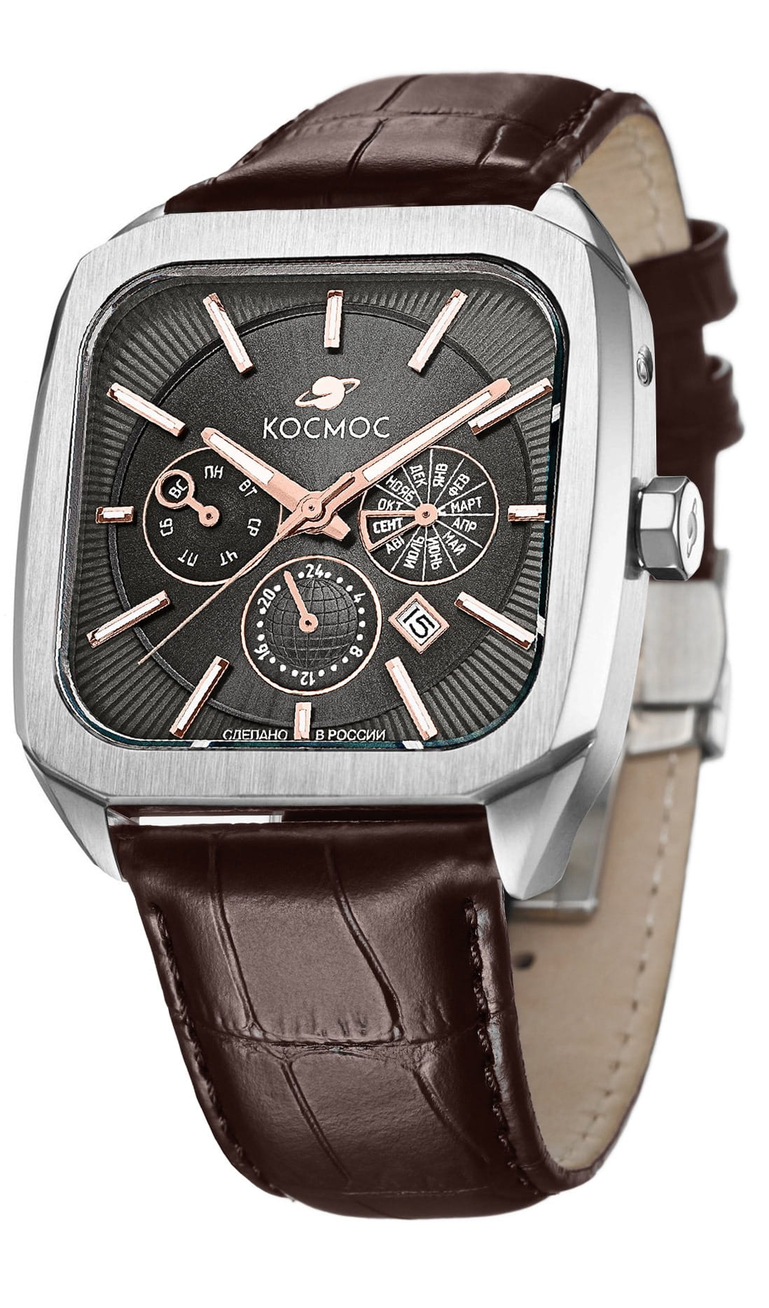 Мужские наручные часы Космос Марсоход II K 219.12.34 — это уникальная лимитированная серия, посвященная аппарату, способному передвигаться по поверхности Красной планеты. Марсоход ассоциируется с брутальностью, мастерством и технической сложностью. Наша страна дважды запускала подобные аппараты еще в 70-х годах прошлого века. Дизайн часов серии Марсоход вдохновлен лучшими работами советских мастеров, сочетая современные технологии часового искусства с обаянием стиля ретро. Корпус в форме квадрата с закругленными углами выполнен из нержавеющей стали украшенной зеркальной полировкой и сатинированием. Удобная заводная головка имеет форму гайки, что добавляет модели индустриальный шарм. Задняя крышка прозрачная, закрепленная на четырех винтах, и позволяет увидеть работу механизма TMI с подвижным ротором, на котором гравируется надпись «Сделано в России». Также здесь представлена гравировка с изображением космонавта, придающая часам особую значимость. Водостойкость достигает 10 атм (WR100), что позволяет использовать часы при плавании и других водных видах спорта. На задней крышке указан индивидуальный номер модели в формате от 01/50 до 50/50. Объемный циферблат состоит из двух уровней. В центре движутся три стрелки, часовая и минутная из которых имеют люминесцентное покрытиеЛюминесцентное покрытиеПозволяет считывать показания времени в темноте. Производители наносят на стрелки, часовые индексы, безель или поверхность циферблата светонакопительный состав, дающий холодное свечение., позволяющее определять время даже в темноте. Также, здесь расположили три дополнительных индикатора: день недели, месяц и время в формате 24-х часов. Для обозначения дня недели и месяца используется кириллица. Окошко даты между 4 и 5 часами выделено накладной рамкой. Циферблат защищен прочным сапфировым стеклом с антибликовым покрытиемСапфировое стеклоПрочный и надёжный материал из кристалла сапфира синтетического происхождения, характеризующийся особой твёрдостью и устойчивостью к царапинам и повреждениям., обеспечивающим отличную читаемость показаний в любых условиях. Второй уровень декорирован гильоше в виде солнечных лучей, на нем закреплены накладные индексы. Браслет изготовлен из натуральной кожи коричневого цвета и оснащен удобной застёжкой «бабочка» с кнопкамиЗастёжка "бабочка"Такой вид застёжки дополняется предохранителями, помогающими избежать случайного раскрытия браслета. Обладают изящным исполнением. , которая сводит к минимуму вероятность потери. Заводная головка, застежка и браслет украшены фирменным логотипом бренда. Коллекция Марсоход — идеальный выбор для ценителей истории космических достижений и современных технологий.