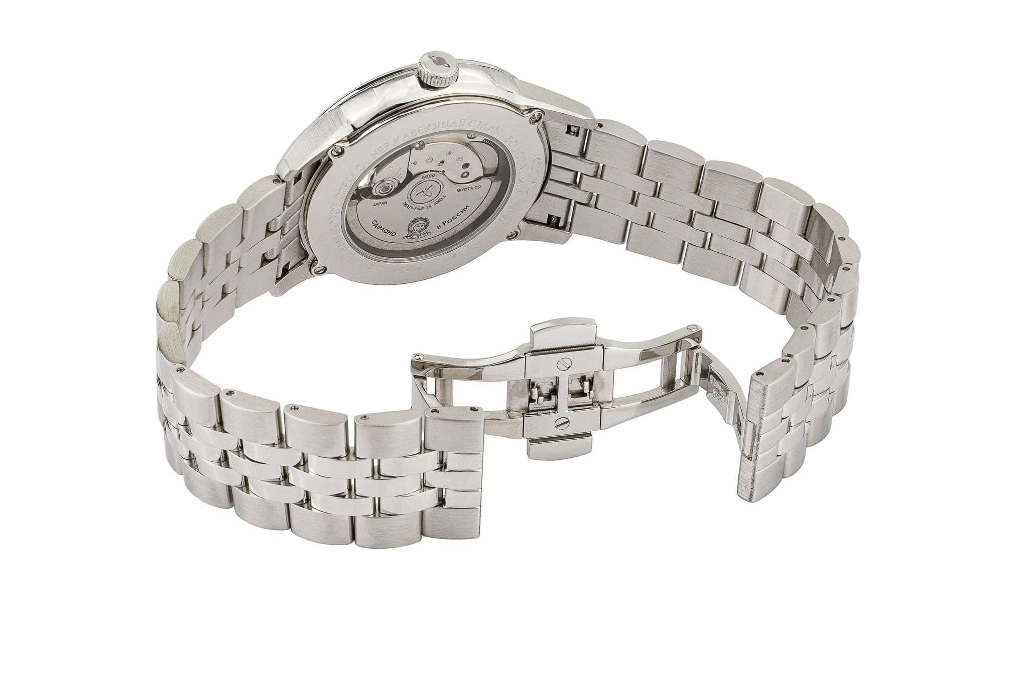 Мужские наручные часы Космос Телескоп K 304.10.33 — это уникальная лимитированная серия под названием Телескоп, посвящена аппарату приоткрывающего взгляду бескрайние дали космического пространства. Апертура открытого баланса модели по форме напоминает круглую линзу телескопа. Сквозь это окошко, расположенное на черном циферблате, также можно увидеть много интересного: ту самую систему «баланс-спираль» автоматического механизма, которая отвечает за точность хода. Корпус часов выполнен из нержавеющей стали, классической круглой формы и достаточно тонкий для механических моделей. Это стало возможным благодаря использованию механизма Miyota, калибр 9029, с высотой всего 3.9 мм. Циферблат декорирован вертикальной текстурой в ретро-стиле, по которой движутся крупные часовая и минутная стрелки, имеющие люминесцентное покрытиеЛюминесцентное покрытиеПозволяет считывать показания времени в темноте. Производители наносят на стрелки, часовые индексы, безель или поверхность циферблата светонакопительный состав, дающий холодное свечение., позволяющее определять время даже в темноте. Циферблат защищен прочным сапфировым стеклом с антибликовым покрытиемСапфировое стеклоПрочный и надёжный материал из кристалла сапфира синтетического происхождения, характеризующийся особой твёрдостью и устойчивостью к царапинам и повреждениям., обеспечивающим отличную читаемость показаний в любых условиях. Прозрачная задняя крышка, закрепленная на четырех винтах, демонстрирует механизм и содержит выгравированный индивидуальный номер экземпляра хх/50, отражающий лимитированный тираж всего в 50 штук. Браслет изготовлен из нержавеющей стали и оснащен удобной застёжкой «бабочка» с кнопкамиЗастёжка "бабочка"Такой вид застёжки дополняется предохранителями, помогающими избежать случайного раскрытия браслета. Обладают изящным исполнением. , которая сводит к минимуму вероятность потери. Модель Телескоп сочетает классический дизайн и универсальность, прекрасно подходя как к деловому костюму, так и к более повседневным образам.