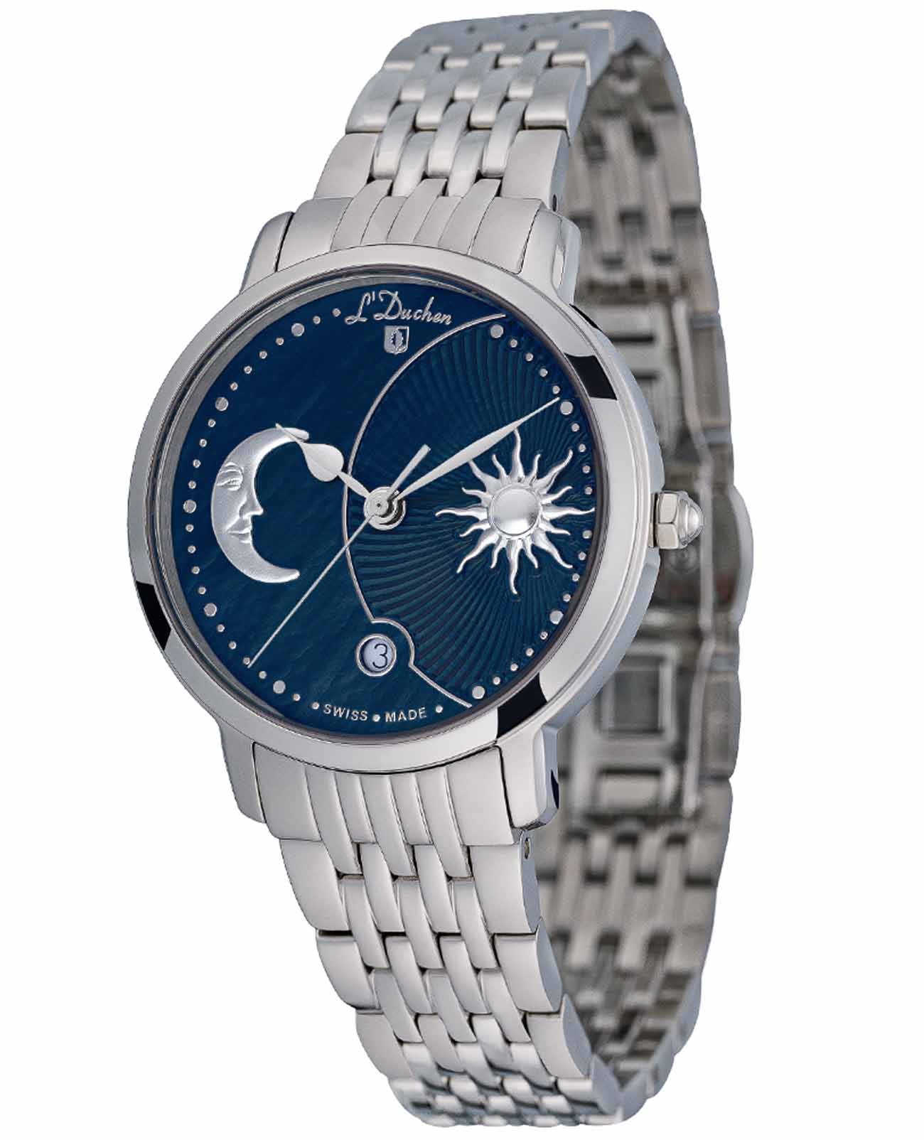 Женские швейцарские часы L'Duchen Day & Night D 781.10.37, кварцевый механизм с высокой точностью. Сапфировое стеклоСапфировое стеклоПрочный и надёжный материал из кристалла сапфира синтетического происхождения, характеризующийся особой твёрдостью и устойчивостью к царапинам и повреждениям. устойчивое к появлению царапин, обладающее высокой прозрачностью. Корпус часов выполнен из нержавеющей стали. Окошко даты находится в положении 6 часов. Класс водозащиты: 50 метров, позволит защитить корпус от случайных брызг или капель дождя. Стальной браслет на застёжке «бабочка» с кнопкамиЗастёжка "бабочка"Такой вид застёжки дополняется предохранителями, помогающими избежать случайного раскрытия браслета. Обладают изящным исполнением. .