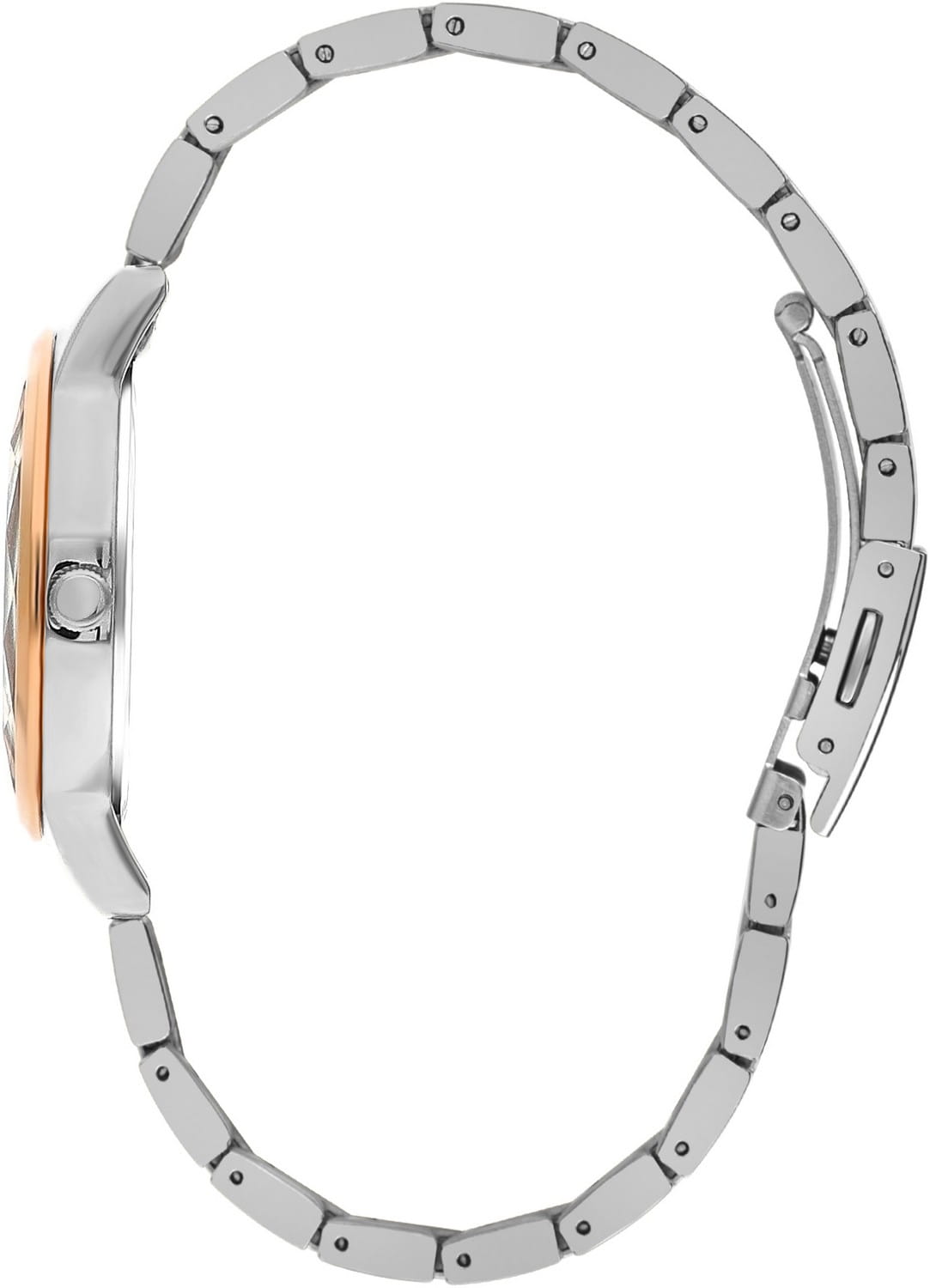 Женские часы Lee Cooper LC07501.530 — это стильное сочетание элегантности и современного дизайна. Круглый корпус диаметром 34 мм выполнен из суперметалла в серебристом цвете, а неподвижный безельБезельВнешний ободок, закрепляющий стекло. В спортивных часах так называется поворотное кольцо с делениями на циферблате, выполняет роль таймера – замеряет отрезки времени на шкале. Неподвижный безель – элемент декора. Однонаправленно вращающийся безель на дайверских часах позволяет фиксировать моменты погружения и выныривания на поверхность. с IP-покрытиемIP-покрытиеМетод ионного напыления. Демонстрирует повышенную устойчивость к истиранию, окислению и химическим веществам. Под воздействием высокого давления и температуры около 1500°C молекулы металла надёжно соединяются с частицами корпуса часов. цвета розового золота, придает модели особый блеск. Серебристый циферблат защищен минеральным стекломМинеральное стеклоМинеральное стекло представляет собой искусственно выращенный минерал кварца. Такое стекло отличается особой устойчивостью к повреждениям и царапинам. Уступает по некоторым качествам сапфировому стеклу., обеспечивающим устойчивость к царапинам. Метки инкрустированы цирконами. Часы оснащены надежным кварцевым механизмом, а металлический браслет с частичным IP-покрытиемIP-покрытиеМетод ионного напыления. Демонстрирует повышенную устойчивость к истиранию, окислению и химическим веществам. Под воздействием высокого давления и температуры около 1500°C молекулы металла надёжно соединяются с частицами корпуса часов. на раскладной застёжкеРаскладная застёжкаТакой тип застёжки используется только на браслетах из металла. Она никогда не раскрывается полностью, происходит разделение на 2 и более частей. Раскладывающая застёжка снизит вероятность потери часов к минимуму. гарантирует комфортную посадку на запястье. Водозащита 30 метров защищает модель от случайных брызг и дождя. Lee Cooper  — отличный выбор для тех, кто ценит утонченность и качество.