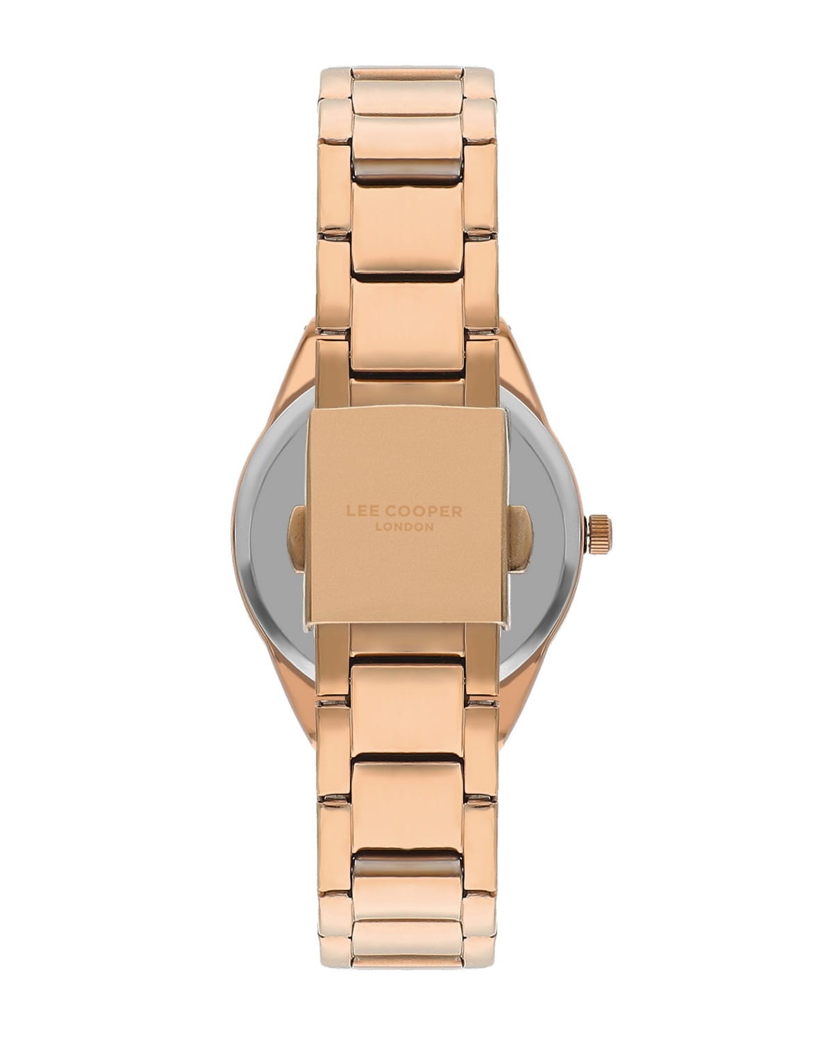 Женские часы Lee Cooper LC07863.430 — это стильное сочетание элегантности и современного дизайна. Круглый корпус диаметром 34 мм выполнен из суперметалла с IP-покрытиемIP-покрытиеМетод ионного напыления. Демонстрирует повышенную устойчивость к истиранию, окислению и химическим веществам. Под воздействием высокого давления и температуры около 1500°C молекулы металла надёжно соединяются с частицами корпуса часов. золотого цвета, а неподвижный безельБезельВнешний ободок, закрепляющий стекло. В спортивных часах так называется поворотное кольцо с делениями на циферблате, выполняет роль таймера – замеряет отрезки времени на шкале. Неподвижный безель – элемент декора. Однонаправленно вращающийся безель на дайверских часах позволяет фиксировать моменты погружения и выныривания на поверхность. украшен цирконами, придающими модели особый блеск. Серебристый циферблат защищен минеральным стекломМинеральное стеклоМинеральное стекло представляет собой искусственно выращенный минерал кварца. Такое стекло отличается особой устойчивостью к повреждениям и царапинам. Уступает по некоторым качествам сапфировому стеклу., обеспечивающим устойчивость к царапинам. Метки в виде штрихов. Часы оснащены надежным кварцевым механизмом, а металлический браслет с IP-покрытиемIP-покрытиеМетод ионного напыления. Демонстрирует повышенную устойчивость к истиранию, окислению и химическим веществам. Под воздействием высокого давления и температуры около 1500°C молекулы металла надёжно соединяются с частицами корпуса часов. на раскладной застёжкеРаскладная застёжкаТакой тип застёжки используется только на браслетах из металла. Она никогда не раскрывается полностью, происходит разделение на 2 и более частей. Раскладывающая застёжка снизит вероятность потери часов к минимуму. гарантирует комфортную посадку на запястье. Мультифункциональная модель с индикацией даты, дня недели, с дополнительным 24-х часовым индикатором. Водозащита 30 метров защищает модель от случайных брызг и дождя. Lee Cooper — отличный выбор для тех, кто ценит утонченность и качество.
