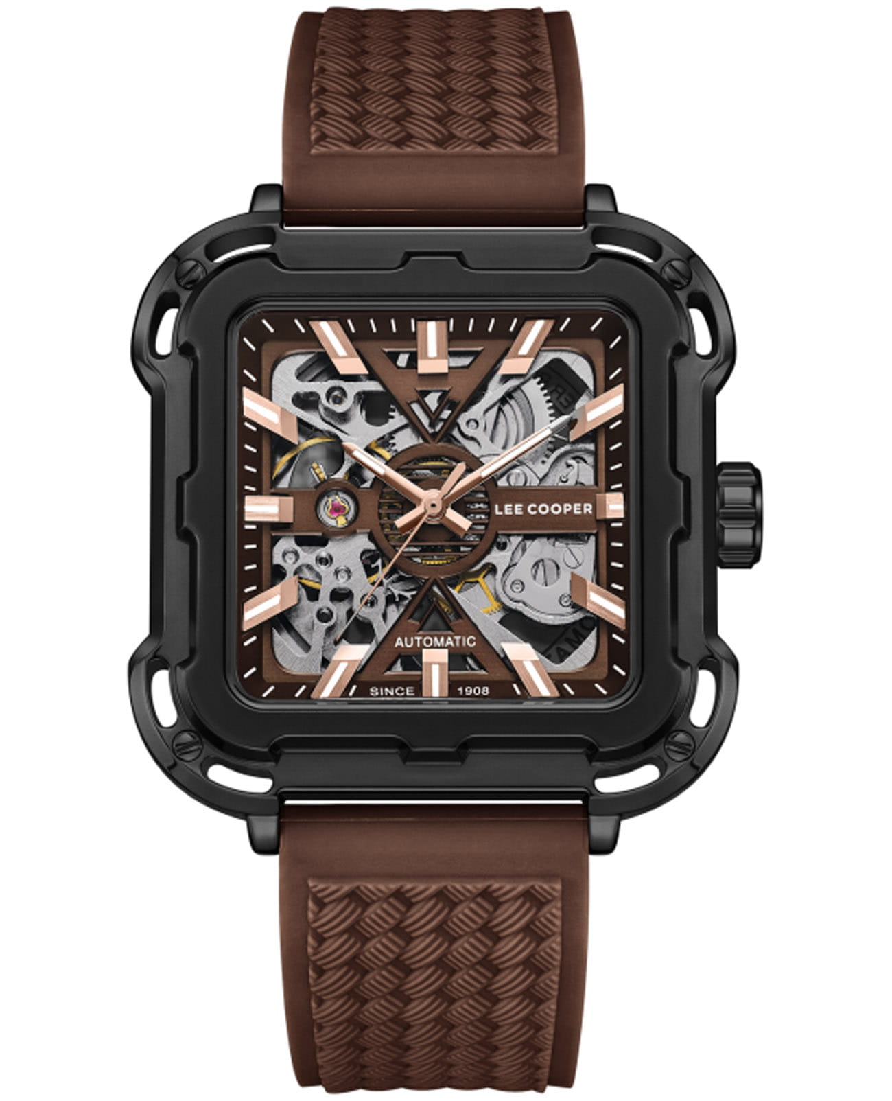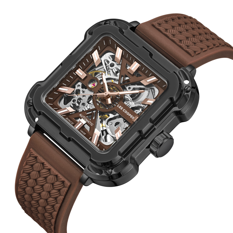 Мужские наручные часы Lee Cooper LC08072.644 из коллекции Classic оснащены автоматическим механизмом калибра G3265ZH, который заряжается от движения руки и обеспечивает надежность и точность хода. Корпус часов выполнен из металла с черным с IP-покрытиемIP-покрытиеМетод ионного напыления. Демонстрирует повышенную устойчивость к истиранию, окислению и химическим веществам. Под воздействием высокого давления и температуры около 1500°C молекулы металла надёжно соединяются с частицами корпуса часов., что придает модели современный и стильный вид. Циферблат имеет уникальный скелетонизированный дизайн, позволяющий наблюдать за работой механизма, что делает часы не только функциональными, но и визуально привлекательными. Для защиты циферблата используется минеральное стеклоМинеральное стеклоМинеральное стекло представляет собой искусственно выращенный минерал кварца. Такое стекло отличается особой устойчивостью к повреждениям и царапинам. Уступает по некоторым качествам сапфировому стеклу., устойчивое к царапинам и механическим повреждениям. Корпус имеет размеры 44 x 49 мм. Ремешок изготовлен из каучука коричневого цвета и гармонично дополняет общий дизайн модели. Стандартная застежка. Часы обладают водонепроницаемостью до 50 метров (5 АТМ), что позволяет использовать их в повседневной жизни, включая контакт с водой при мытье рук или дожде. Эти часы станут идеальным выбором для мужчин, ценящих стиль, качество и функциональность.