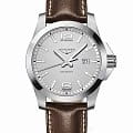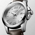 Часы Longines Conquest (артикул L37604765) сочетают спортивную элегантность и высокую функциональность, характерные для коллекции Conquest. Корпус диаметром 43 мм выполнен из нержавеющей стали с водозащитой до 30 бар (300 метров). Завинчивающаяся заводная головка и задняя крышка подчёркивают надёжность. Серебристый циферблат с солнечным узором оснащён накладными арабскими цифрами и индексами, стрелками с люминесцентным покрытиемЛюминесцентное покрытиеПозволяет считывать показания времени в темноте. Производители наносят на стрелки, часовые индексы, безель или поверхность циферблата светонакопительный состав, дающий холодное свечение., а также окошком даты в положении «3 часа». Циферблат защищён сапфировым стекломСапфировое стеклоПрочный и надёжный материал из кристалла сапфира синтетического происхождения, характеризующийся особой твёрдостью и устойчивостью к царапинам и повреждениям. с антибликовым покрытием.
