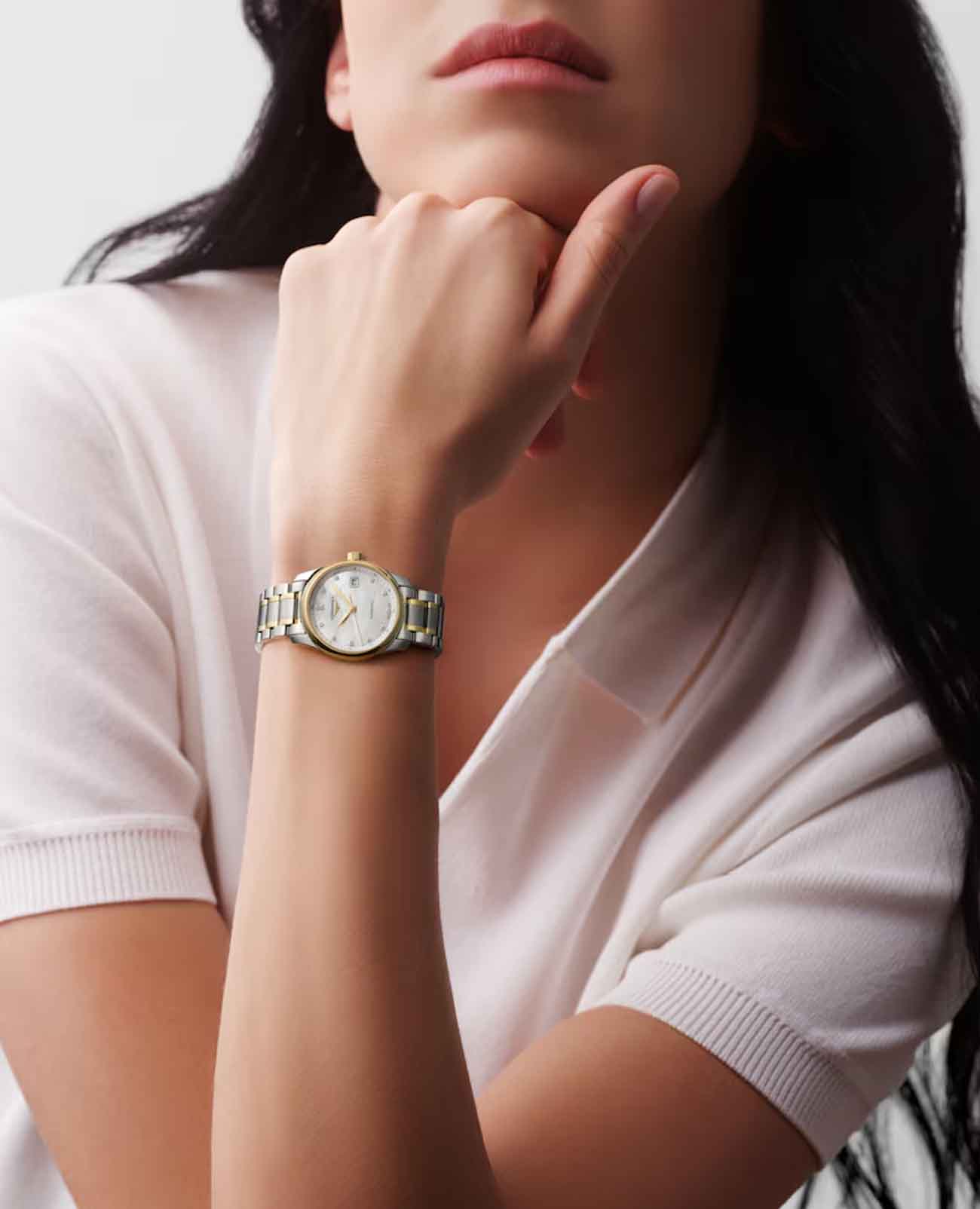 Циферблат украшен 12 бриллиантами группы Top Wesselton VS-SI общим весом 0.034 карата, что добавляет часам дополнительную роскошь и блеск. Окошко даты расположено в положении 3 часа, что удобно для быстрого ознакомления с текущей датой.