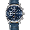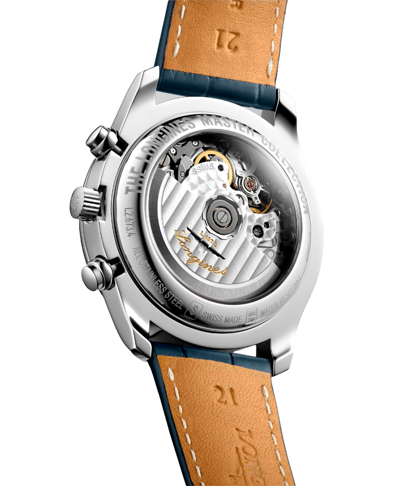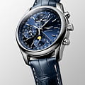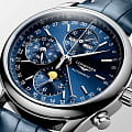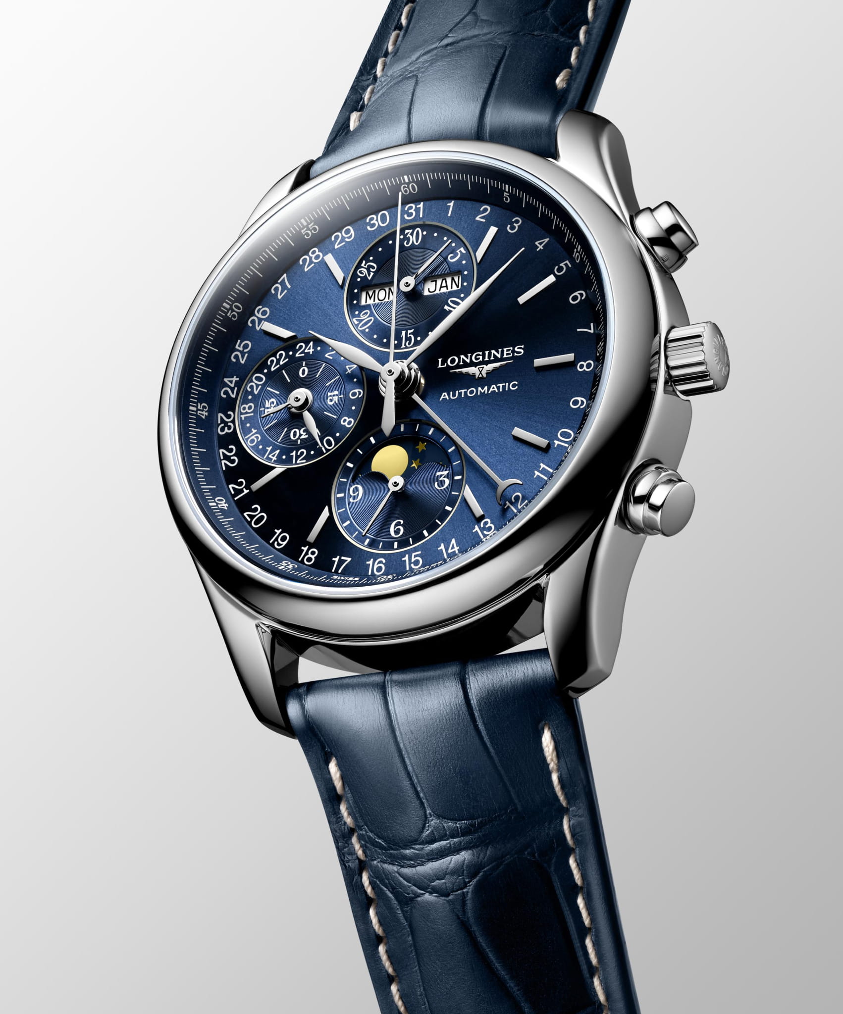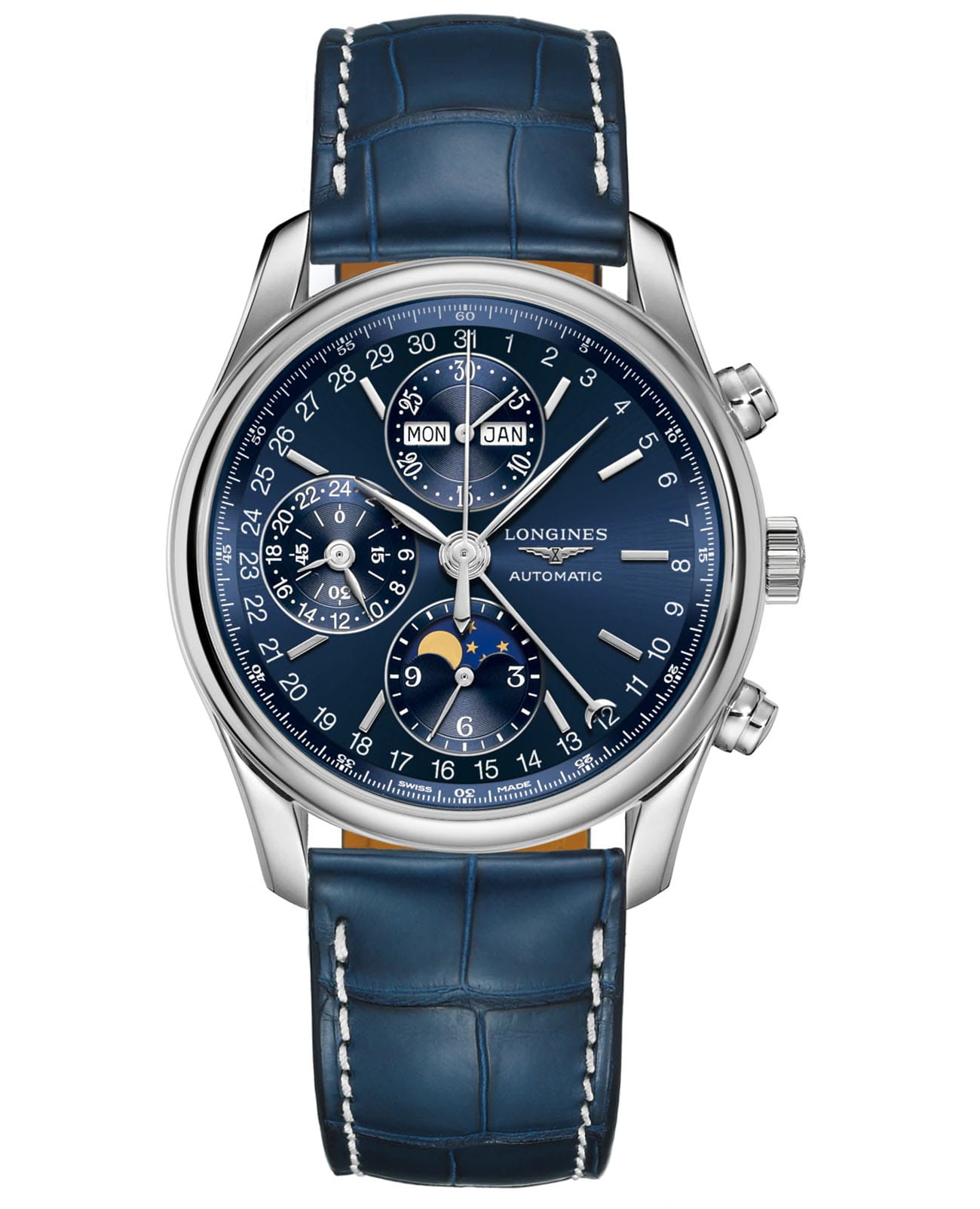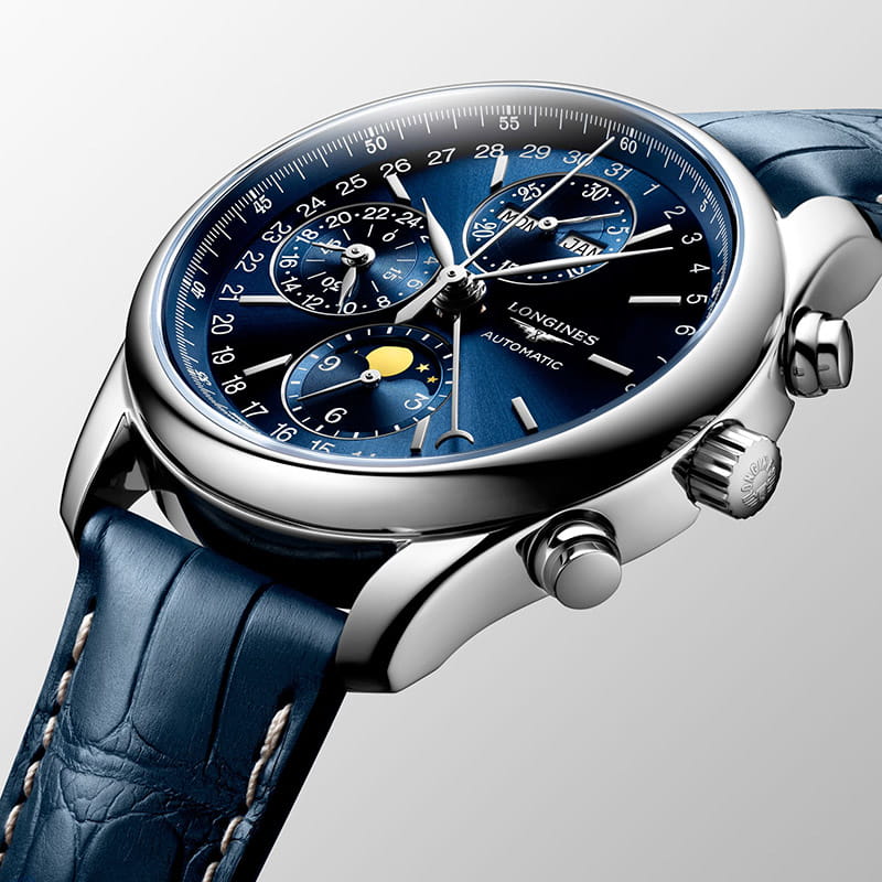 Часы Longines Master Collection Chronograph Moonphase (артикул L26734920) сочетают в себе элегантность и сложные функции, отражая богатое часовое наследие Longines. Корпус диаметром 40 мм выполнен из нержавеющей стали с водозащитой до 3 бар (30 метров). Синий циферблат с солнечным узором оснащён арабскими цифрами, стрелками с родиевым покрытием и многочисленными функциями: указатель даты центральной стрелкой, индикатор фаз луны и 12-часовой счётчик на «6 часах», 30-минутный счётчик с указателями дня недели и месяца на «12 часах», а также 24-часовой индикатор и малая секундная стрелка на «9 часах». Циферблат защищён сапфировым стекломСапфировое стеклоПрочный и надёжный материал из кристалла сапфира синтетического происхождения, характеризующийся особой твёрдостью и устойчивостью к царапинам и повреждениям. с антибликовым покрытием.