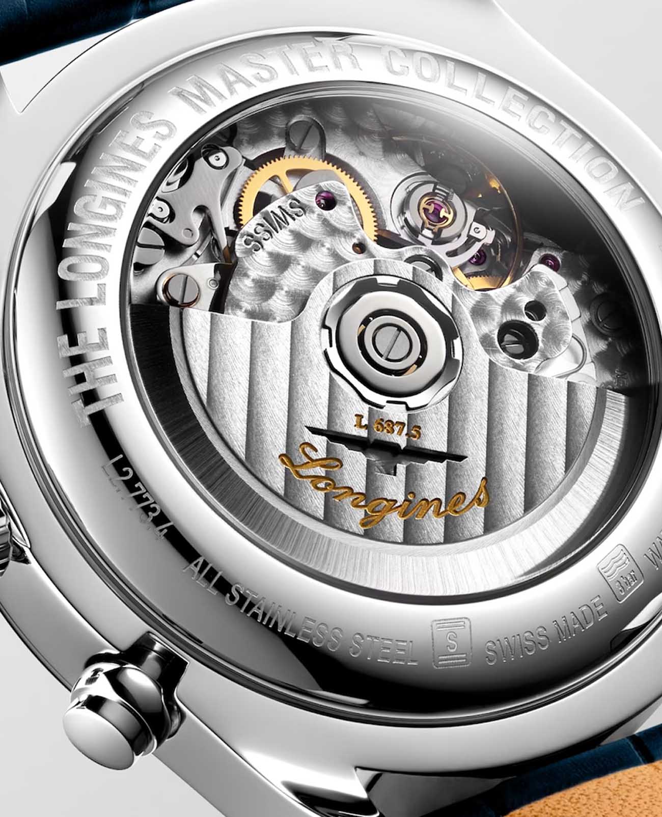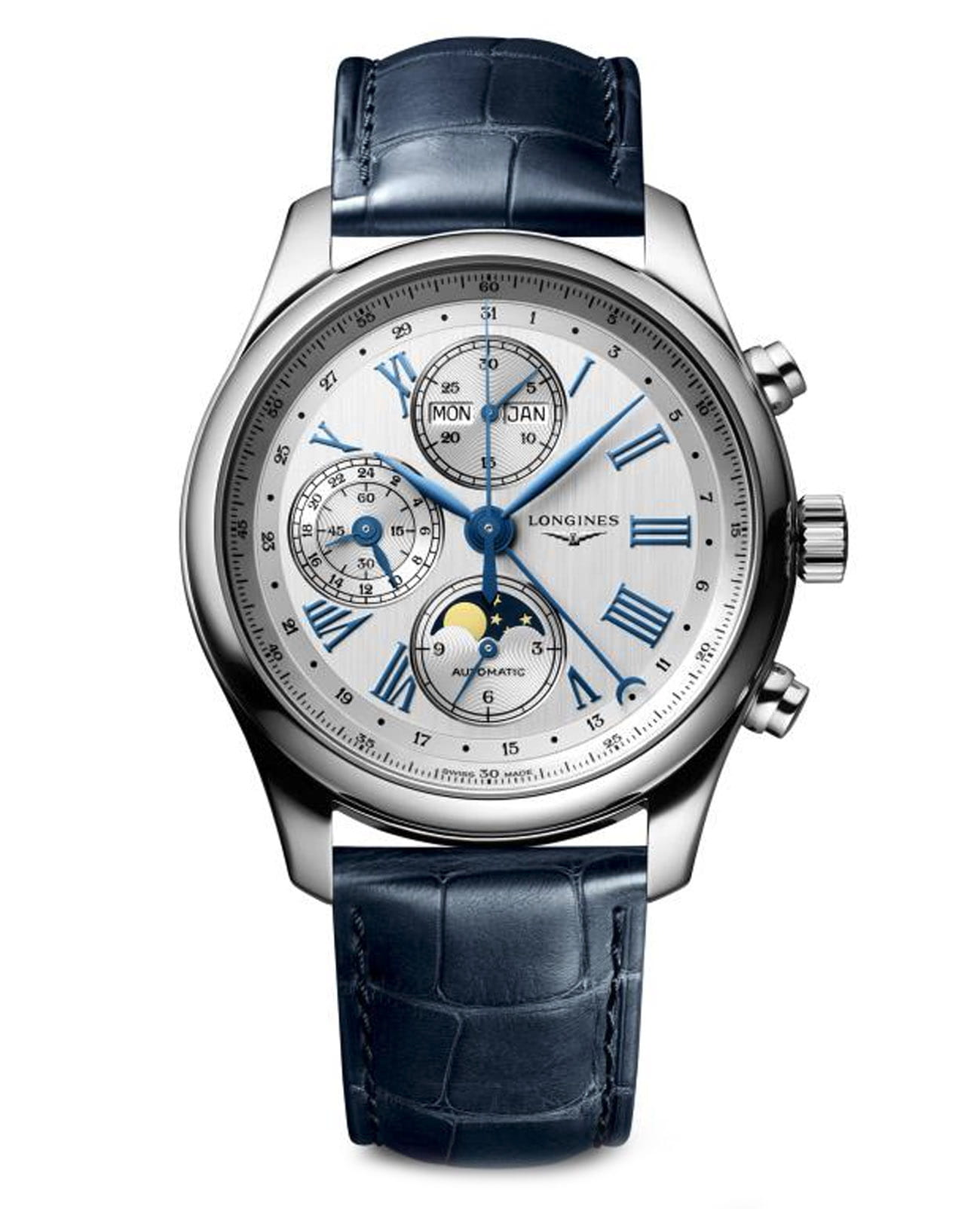 Мужсике швейцарские механические часы-хронографХронографФункция позволяет измерять отрезки времени с особой точностью: часы, минуты, секунды. Верным признаком хронографа является наличие на циферблате 3 дополнительных окошек-счётчиков. с автоподзаводом Longines Master Collection L2.773.4.71.2. Сапфировое стеклоСапфировое стеклоПрочный и надёжный материал из кристалла сапфира синтетического происхождения, характеризующийся особой твёрдостью и устойчивостью к царапинам и повреждениям. устойчивое к появлению царапин, обладающее высокой прозрачностью. Корпус часов изготовлен из нержавеющей стали. Функции: часы, минуты, малая секундная стрелка с 24-часовым индикатором в положении 9 часов. Дату показывает центральная стрелка с серповидным наконечником. Указатель фаз Луны в положении 6 часов. Прозрачная задняя крышка. Класс водозащиты: 30 метров, позволит защитить корпус от случайных брызг или капель дождя. Ремешок из кожи аллигатора на раскладной застёжкеРаскладная застёжкаТакой тип застёжки используется только на браслетах из металла. Она никогда не раскрывается полностью, происходит разделение на 2 и более частей. Раскладывающая застёжка снизит вероятность потери часов к минимуму..