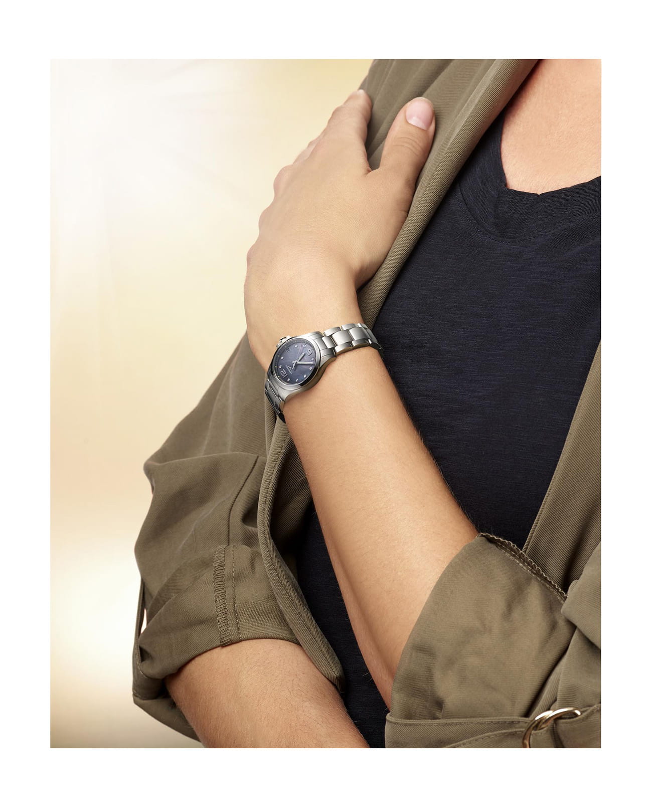 Чёрный перламутровый циферблат дополнен стрелками и метками с люминесцентной подсветкойЛюминесцентное покрытиеПозволяет считывать показания времени в темноте. Производители наносят на стрелки, часовые индексы, безель или поверхность циферблата светонакопительный состав, дающий холодное свечение. и украшен 9 бриллиантами общим весом 0.041 карата. Швейцарский кварцевый механизм L288 обеспечивает максимальную точность хода. Антибликовое покрытиеАнтибликовое покрытиеСлой оксида металла в 0,13-0,3 микрон, благодаря которому стекло часов не бликует и не отражает свет. Антибликовое покрытие уменьшает отражение света в 10 раз, обеспечивая отличную читаемость показателей циферблата. сапфирового стекла улучшает читаемость показаний. Дополнительные возможности: , индикатор EOLEOLПредставляет собой систему, уведомляющую владельца часов о необходимости замены элемента питания. За 2 недели до полного разряда батарейки секундная стрелка перестаёт ходить чётко и начинает перепрыгивать на 3-4 деления..