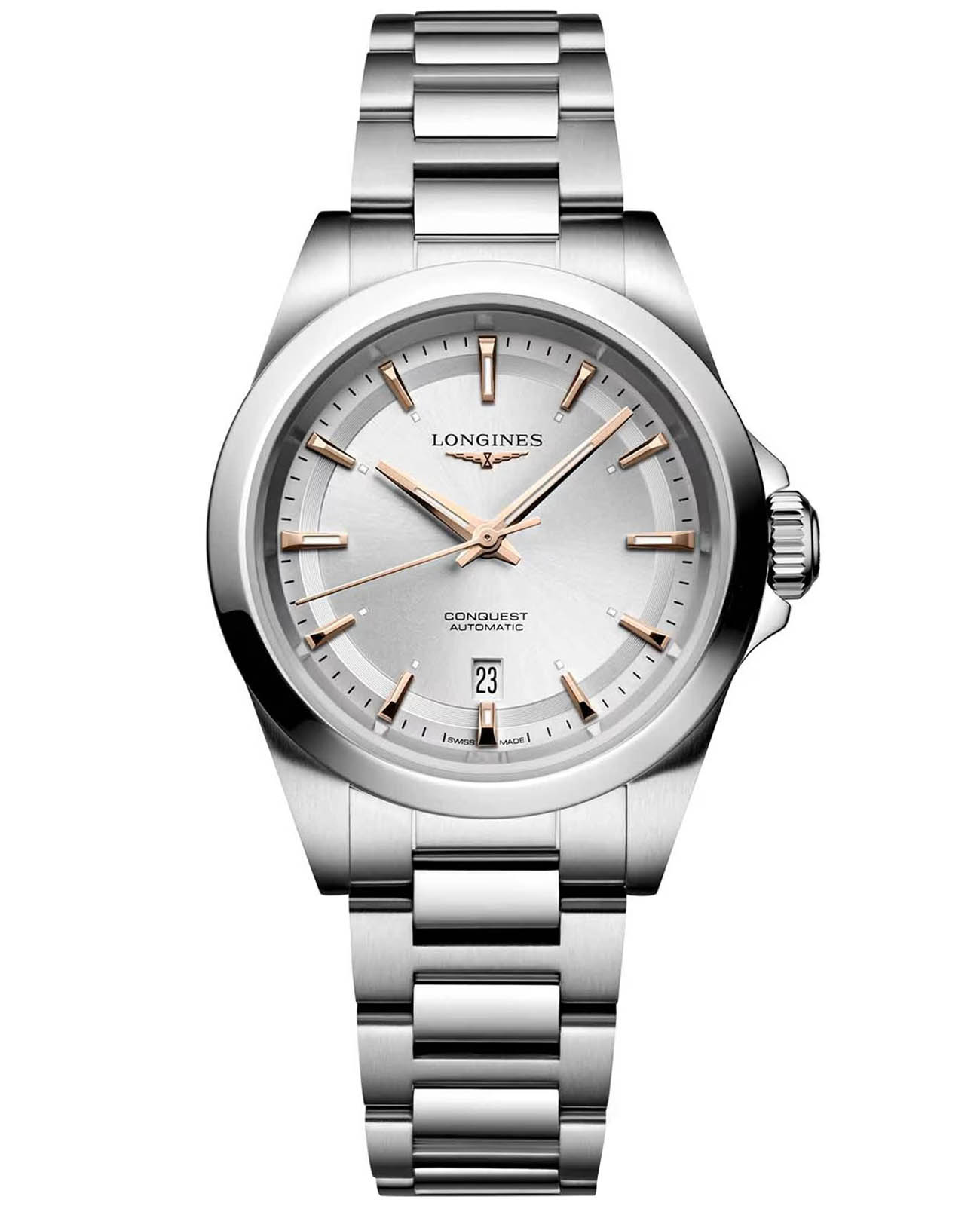 Швейцарские автоматические часы с круглым корпусом из нержавеющей стали диаметром 30 мм и толщиной 9.70 мм оснащены механизмом калибра L592 с автоподзаводом, частотой 28'800 полуколебаний в час и запасом хода до 45 часов. Циферблат защищен сапфировым стекломСапфировое стеклоПрочный и надёжный материал из кристалла сапфира синтетического происхождения, характеризующийся особой твёрдостью и устойчивостью к царапинам и повреждениям.. Завинчивающаяся прозрачная задняя крышка также выполнена из сапфирового стекла. Модель имеет водонепроницаемость до 10 бар, позволит плавать, нырять и заниматься другими водными видами спорта. Стрелки с люминесцентным покрытиемЛюминесцентное покрытиеПозволяет считывать показания времени в темноте. Производители наносят на стрелки, часовые индексы, безель или поверхность циферблата светонакопительный состав, дающий холодное свечение. Swiss Super-LumiNova® обеспечивают хорошую видимость в любое время суток. Часы комплектуются браслетом из нержавеющей стали. Магнитоустойчивый механизм и монокристаллическая кремниевая пружина баланса гарантируют высокую точность хода и надежность использования.
