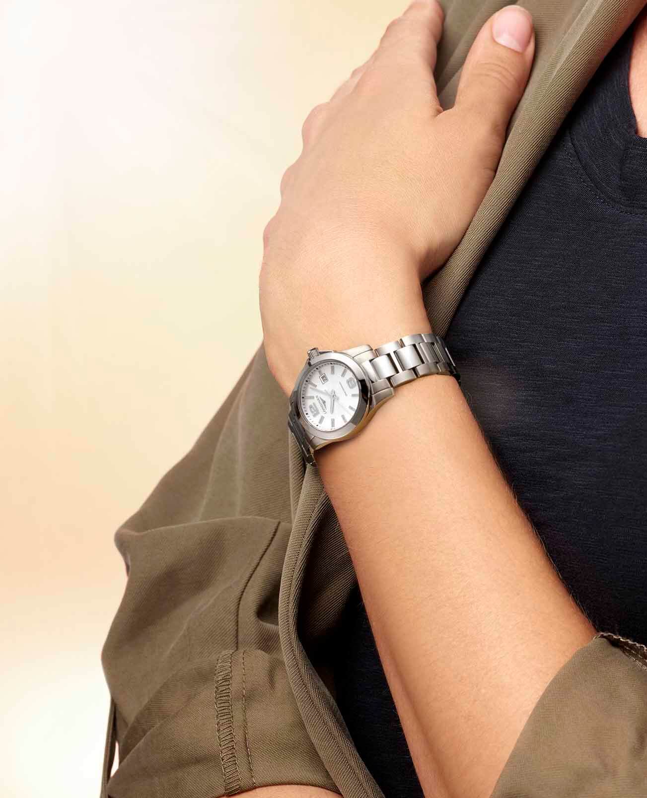Водонепроницаемость класса 30 метров обеспечит защиту от случайных брызг или капель дождя, сохраняя часы в безопасности в течение всего рабочего дня. Завершает композицию стальной браслет с застёжкой «бабочка»Застёжка "бабочка"Такой вид застёжки дополняется предохранителями, помогающими избежать случайного раскрытия браслета. Обладают изящным исполнением.