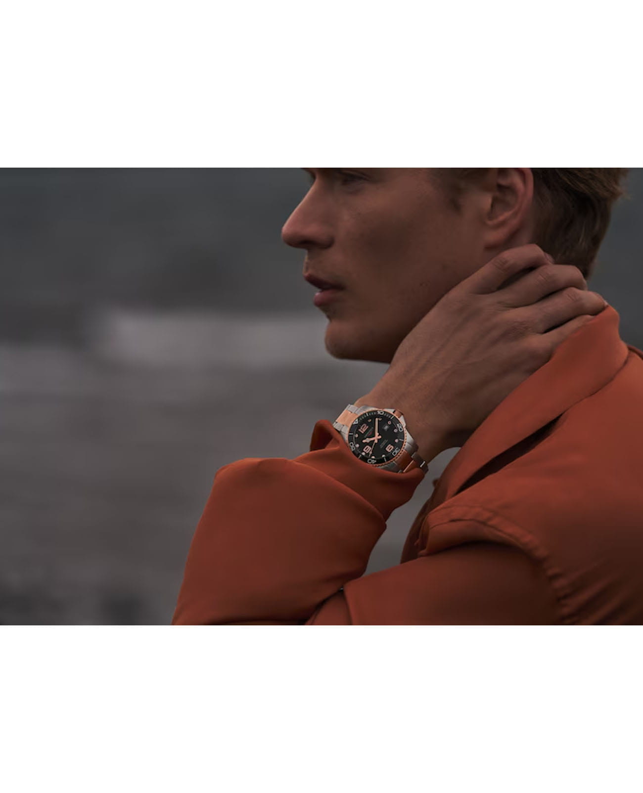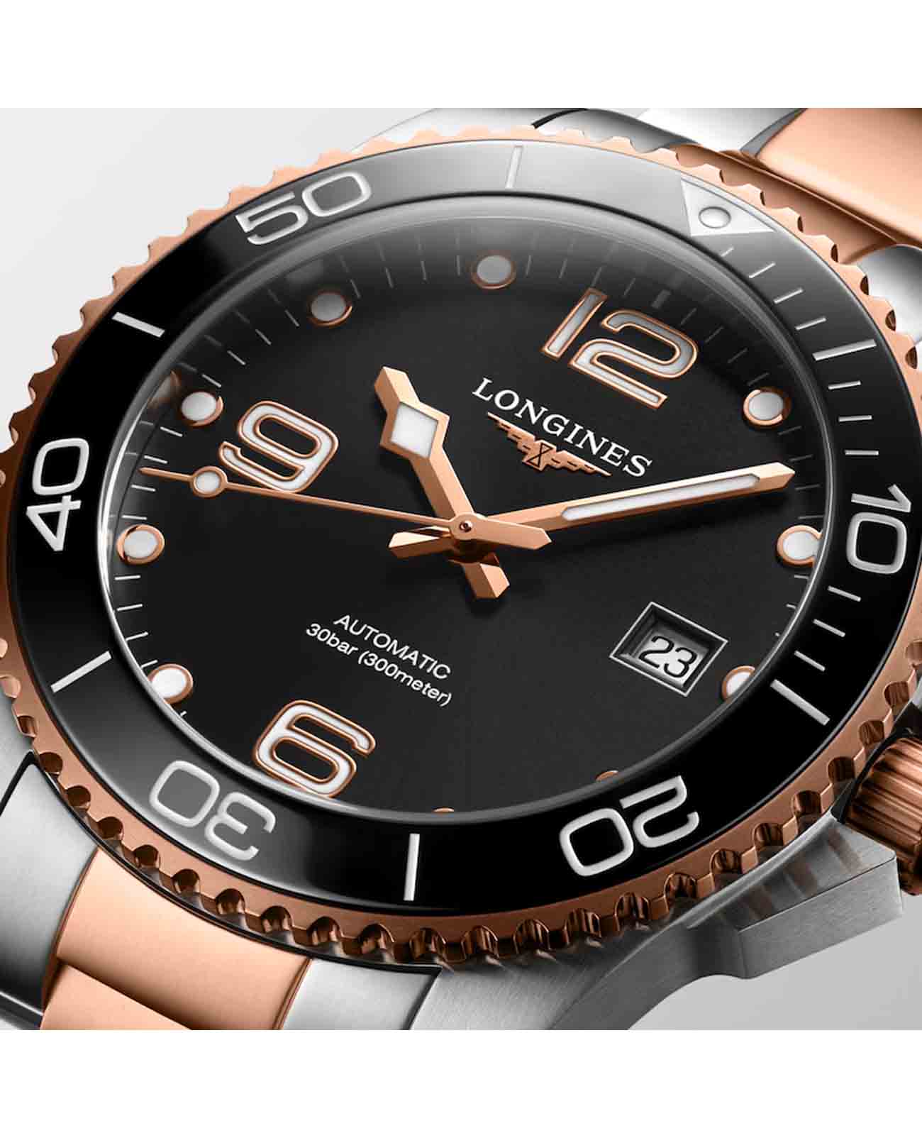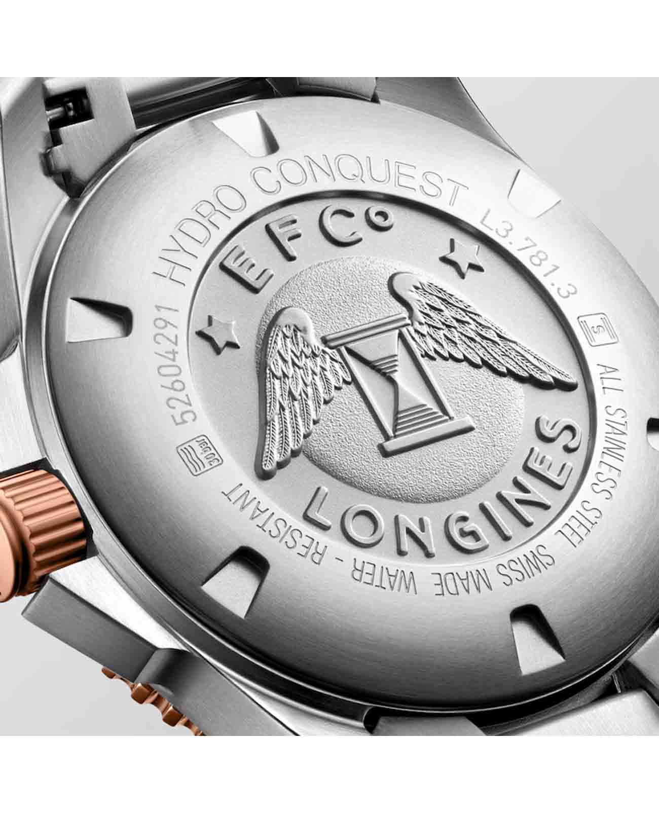 Мужские механические швейцарские часы с автоподзаводом Longines HydroConquest L3.781.3.58.7. Сапфировое стеклоСапфировое стеклоПрочный и надёжный материал из кристалла сапфира синтетического происхождения, характеризующийся особой твёрдостью и устойчивостью к царапинам и повреждениям. с антибликовым покрытием, устойчивое к мелким механическим повреждениям. Корпус часов изготовлен из нержавеющей стали. Вращающийся стальной безельБезельВнешний ободок, закрепляющий стекло. В спортивных часах так называется поворотное кольцо с делениями на циферблате, выполняет роль таймера – замеряет отрезки времени на шкале. Неподвижный безель – элемент декора. Однонаправленно вращающийся безель на дайверских часах позволяет фиксировать моменты погружения и выныривания на поверхность. с люминесцентным покрытиемЛюминесцентное покрытиеПозволяет считывать показания времени в темноте. Производители наносят на стрелки, часовые индексы, безель или поверхность циферблата светонакопительный состав, дающий холодное свечение. Superluminova из нержавеющей стали с PVD-покрытиемPVDУльтратонкое покрытие наносится в технике вакуумного напыления, сочетает в себе нитрид титана особой прочности со слоем золота или оксида хрома. Несёт в себе декоративную или защитную функцию. и керамики, защищенный от царапин, никогда не изнашивается и не выцветает. Стрелки и метки с люминесцентным покрытиемЛюминесцентное покрытиеПозволяет считывать показания времени в темноте. Производители наносят на стрелки, часовые индексы, безель или поверхность циферблата светонакопительный состав, дающий холодное свечение.. Окошко даты находится в положении 3 часа. Класс водозащиты: 300 метров, позволит плавать, нырять и заниматься другими водными видами спорта. Стальной браслет с частичным PVD-покрытиемPVDУльтратонкое покрытие наносится в технике вакуумного напыления, сочетает в себе нитрид титана особой прочности со слоем золота или оксида хрома. Несёт в себе декоративную или защитную функцию. на раскладной застёжкеРаскладная застёжкаТакой тип застёжки используется только на браслетах из металла. Она никогда не раскрывается полностью, происходит разделение на 2 и более частей. Раскладывающая застёжка снизит вероятность потери часов к минимуму. с удлинением для дайверов.
