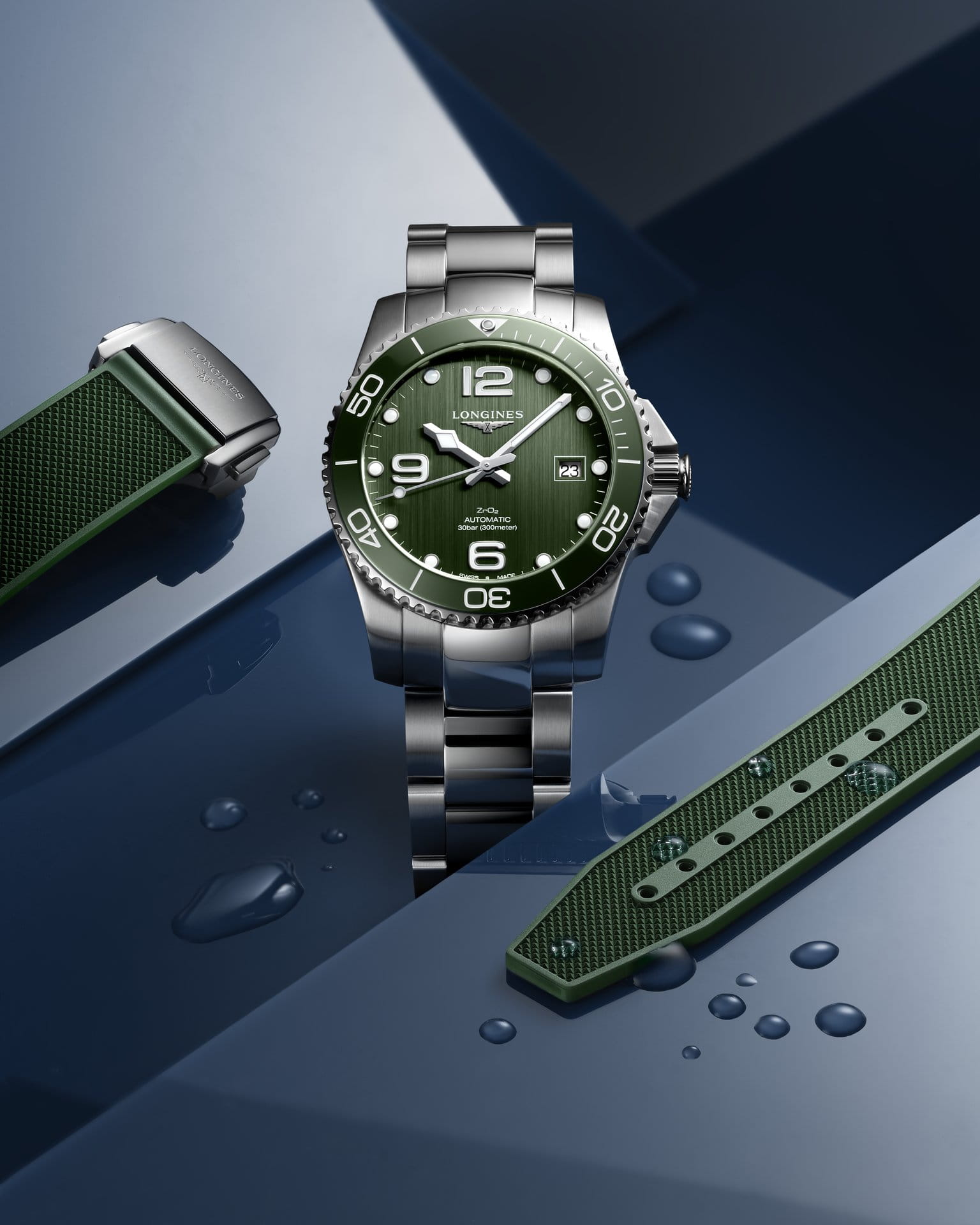 Зелёный циферблат с крупной индикаций времени дополнен контрастными стрелками и метками с люминесцентной подсветкойЛюминесцентное покрытиеПозволяет считывать показания времени в темноте. Производители наносят на стрелки, часовые индексы, безель или поверхность циферблата светонакопительный состав, дающий холодное свечение.. Керамический безельБезельВнешний ободок, закрепляющий стекло. В спортивных часах так называется поворотное кольцо с делениями на циферблате, выполняет роль таймера – замеряет отрезки времени на шкале. Неподвижный безель – элемент декора. Однонаправленно вращающийся безель на дайверских часах позволяет фиксировать моменты погружения и выныривания на поверхность. вращается в одном направлении, завинчивающаяся заводная головка и задняя крышка усиливают водостойкость до 30 бар. Швейцарский автоматический механизм L888 имеет резерв хода на 64 часа.