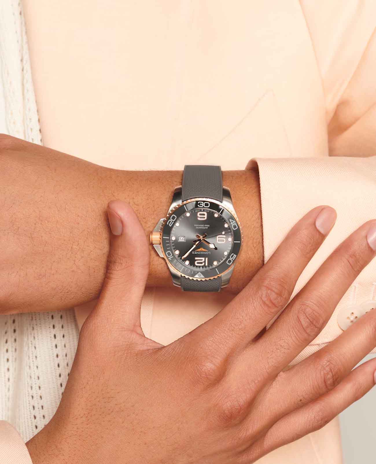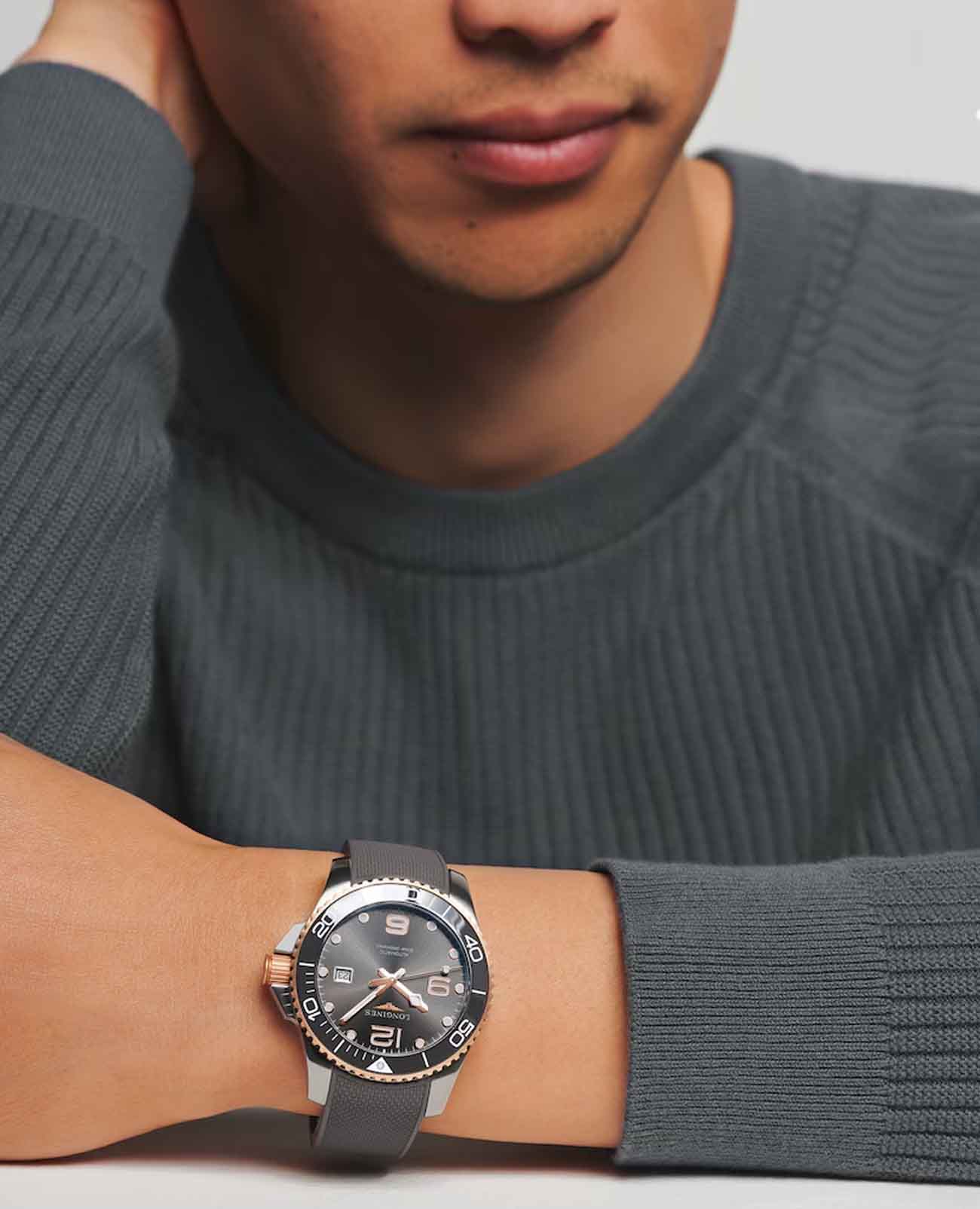 Мужские швейцарские механические часы для дайвинга Longines Hydroconquest L3.782.3.78.9. Сапфировое стеклоСапфировое стеклоПрочный и надёжный материал из кристалла сапфира синтетического происхождения, характеризующийся особой твёрдостью и устойчивостью к царапинам и повреждениям. с многослойным антибликовым покрытием с обеих сторон, устойчивое к появлению царапин, обладающее высокой прозрачностью. Корпус часов изготовлен из стали. Вращающийся безельБезельВнешний ободок, закрепляющий стекло. В спортивных часах так называется поворотное кольцо с делениями на циферблате, выполняет роль таймера – замеряет отрезки времени на шкале. Неподвижный безель – элемент декора. Однонаправленно вращающийся безель на дайверских часах позволяет фиксировать моменты погружения и выныривания на поверхность. из стали с PVD-покрытиемPVDУльтратонкое покрытие наносится в технике вакуумного напыления, сочетает в себе нитрид титана особой прочности со слоем золота или оксида хрома. Несёт в себе декоративную или защитную функцию. и керамики, защищенный от царапин, никогда не изнашивается и не выцветает. Стрелки и метки с люминесцентным покрытиемЛюминесцентное покрытиеПозволяет считывать показания времени в темноте. Производители наносят на стрелки, часовые индексы, безель или поверхность циферблата светонакопительный состав, дающий холодное свечение.. Окошко даты находится в положении 3 часов. Класс водозащиты: 300 метров, позволит плавать, нырять и заниматься другими водными видами спорта. Каучковый ремешок на раскладной застёжкеРаскладная застёжкаТакой тип застёжки используется только на браслетах из металла. Она никогда не раскрывается полностью, происходит разделение на 2 и более частей. Раскладывающая застёжка снизит вероятность потери часов к минимуму..