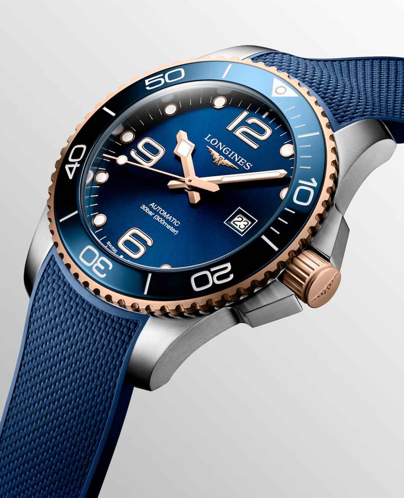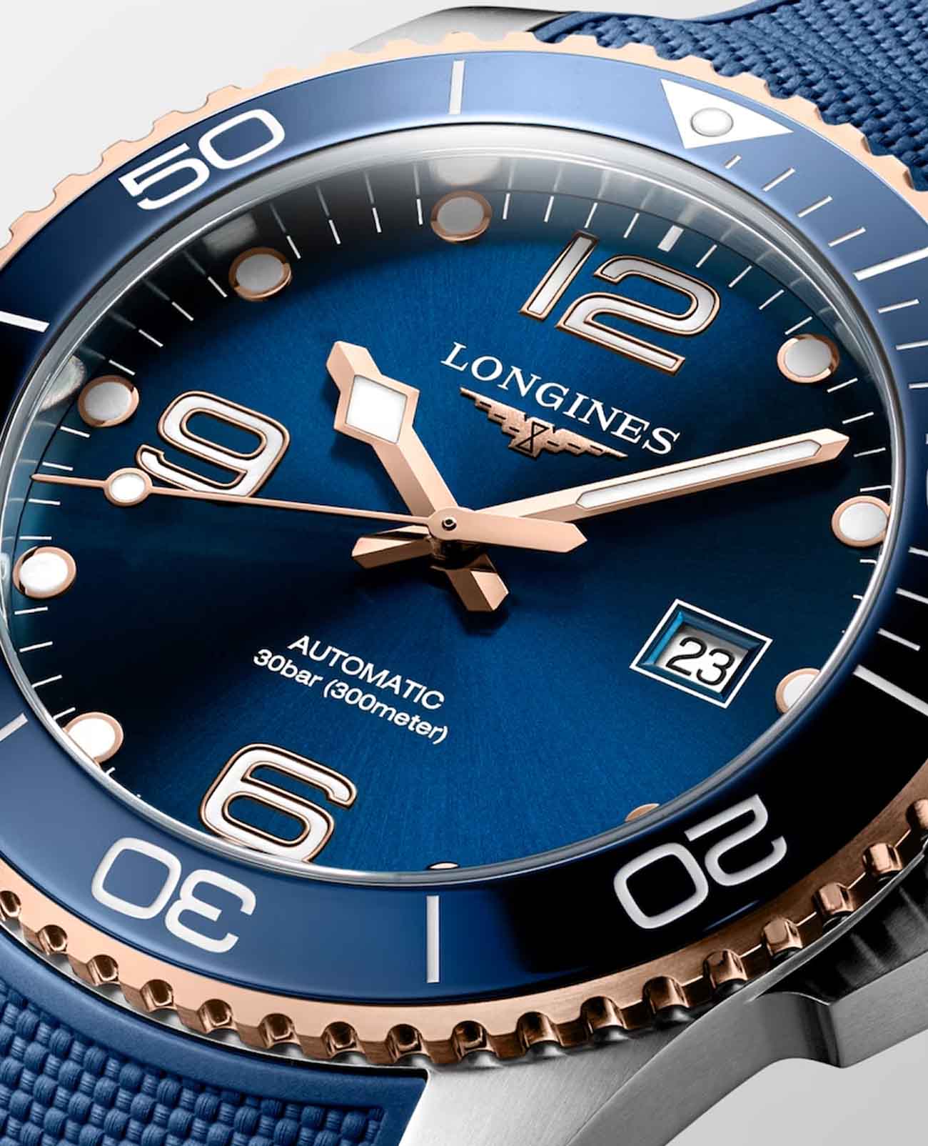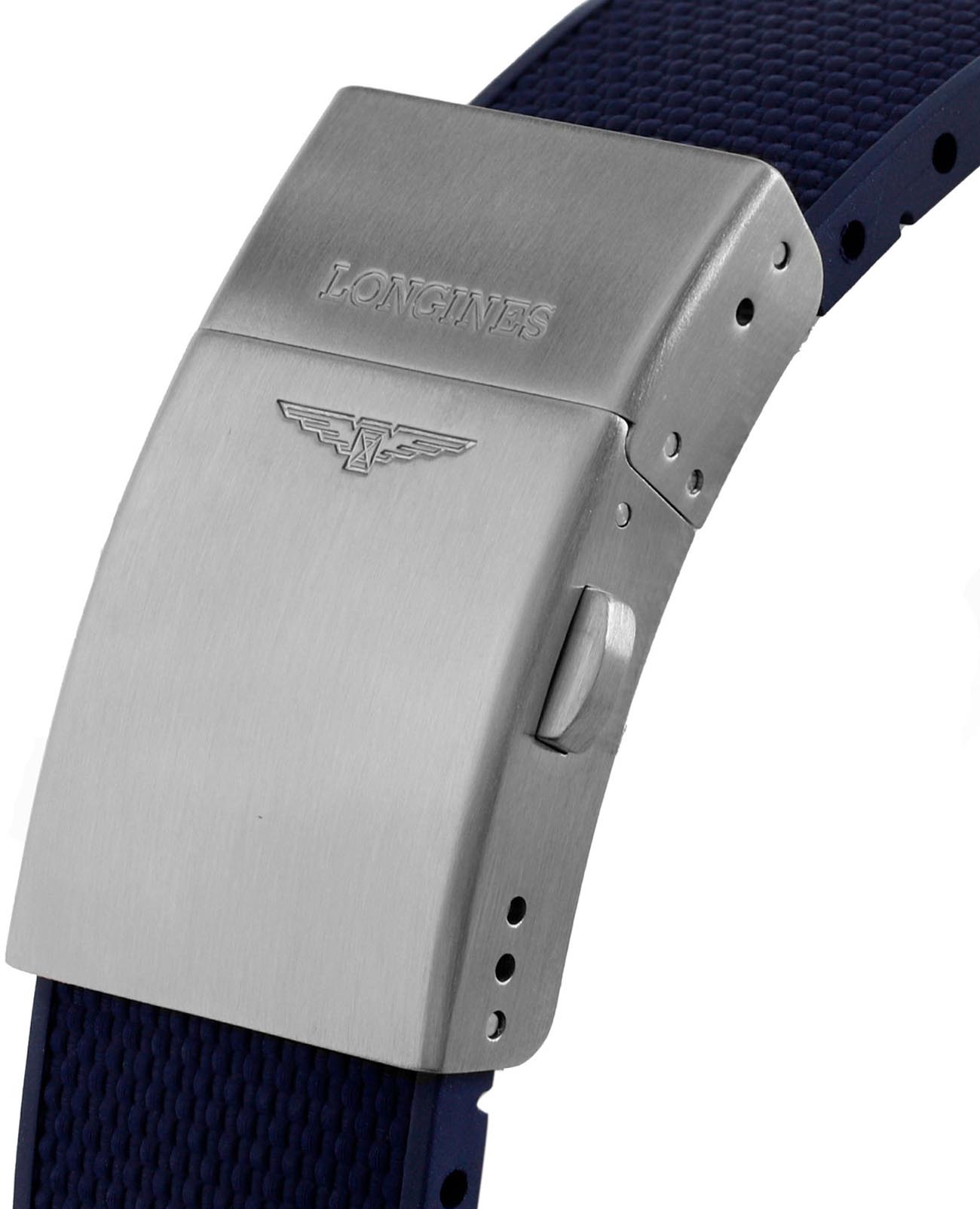 Мужские швейцарские механические часы для дайвинга Longines Hydroconquest L3.782.3.98.9. Сапфировое стеклоСапфировое стеклоПрочный и надёжный материал из кристалла сапфира синтетического происхождения, характеризующийся особой твёрдостью и устойчивостью к царапинам и повреждениям. с многослойным антибликовым покрытием с обеих сторон, устойчивое к появлению царапин, обладающее высокой прозрачностью. Корпус часов изготовлен из стали. Вращающийся безельБезельВнешний ободок, закрепляющий стекло. В спортивных часах так называется поворотное кольцо с делениями на циферблате, выполняет роль таймера – замеряет отрезки времени на шкале. Неподвижный безель – элемент декора. Однонаправленно вращающийся безель на дайверских часах позволяет фиксировать моменты погружения и выныривания на поверхность. из стали с PVD-покрытиемPVDУльтратонкое покрытие наносится в технике вакуумного напыления, сочетает в себе нитрид титана особой прочности со слоем золота или оксида хрома. Несёт в себе декоративную или защитную функцию. и керамики, защищенный от царапин, никогда не изнашивается и не выцветает. Стрелки и метки с люминесцентным покрытиемЛюминесцентное покрытиеПозволяет считывать показания времени в темноте. Производители наносят на стрелки, часовые индексы, безель или поверхность циферблата светонакопительный состав, дающий холодное свечение.. Окошко даты находится в положении 3 часов. Класс водозащиты: 300 метров, позволит плавать, нырять и заниматься другими водными видами спорта. Каучковый ремешок на раскладной застёжкеРаскладная застёжкаТакой тип застёжки используется только на браслетах из металла. Она никогда не раскрывается полностью, происходит разделение на 2 и более частей. Раскладывающая застёжка снизит вероятность потери часов к минимуму..