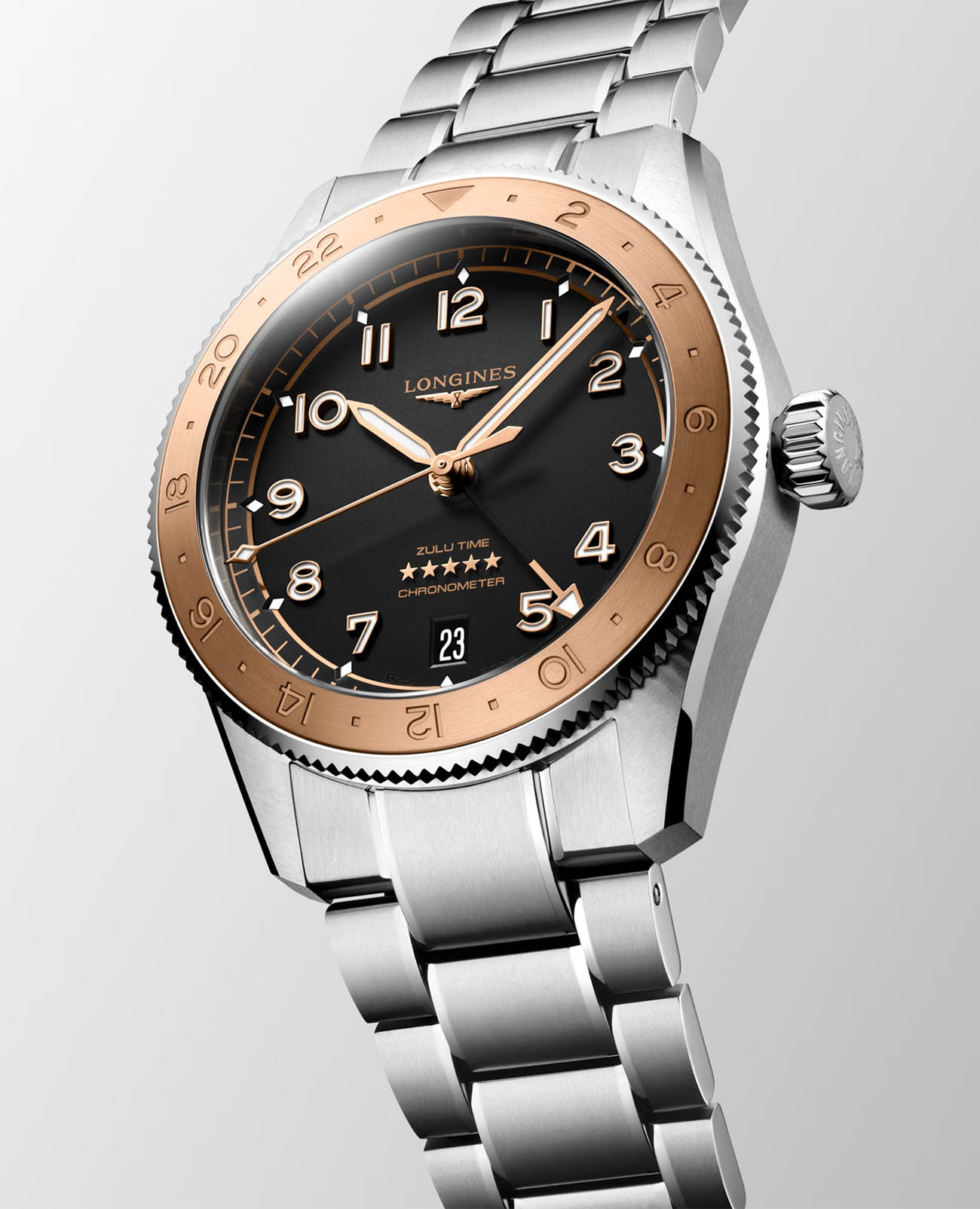 Часы Longines Spirit Zulu Time 1925 L3.803.5.53.6 выполнены в классическом круглом корпусе диаметром 39 мм из нержавеющей стали, 18-каратного розового золота и оснащены двунаправленным вращающимся безелем. Модель укомплектована автоматическим механизмом калибра L844.4, обеспечивающим запас хода до 72 часов. Механизм имеет сертификат хронометра и оснащён балансовой пружиной из монокристаллического кремния, устойчивой к магнитным полям и перепадам температур. Также реализована функция второго часового поясаВторой часовой поясФункция, позволяющая отображать время двух часовых поясов одновременно. и отображение даты. Циферблат матового чёрного цвета дополнен арабскими цифрами с покрытием Swiss Super-LumiNova®Люминесцентное покрытиеПозволяет считывать показания времени в темноте. Производители наносят на стрелки, часовые индексы, безель или поверхность циферблата светонакопительный состав, дающий холодное свечение., что обеспечивает отличную читаемость даже в темноте. Стрелки окрашены в розовый цвет для лучшей контрастности. Защиту циферблата обеспечивает сапфировое стеклоСапфировое стеклоПрочный и надёжный материал из кристалла сапфира синтетического происхождения, характеризующийся особой твёрдостью и устойчивостью к царапинам и повреждениям. с многослойным антибликовым покрытиемАнтибликовое покрытиеСлой оксида металла в 0,13-0,3 микрон, благодаря которому стекло часов не бликует и не отражает свет. Антибликовое покрытие уменьшает отражение света в 10 раз, обеспечивая отличную читаемость показателей циферблата. с обеих сторон. Задняя крышка — прозрачная, выполненная из сапфирового стекла, что позволяет наблюдать за работой механизма. Водозащита позволяет использовать часы в повседневных условиях, включая плавание. Диаметр корпуса — 39 мм, между лугами — 21 мм, толщина — 13.5 мм, общая длина от луга до луга — 46.8 мм. Вес модели — около 158 грамм. Часы установлены на стальной браслет с системой быстрой смены ремешка и оснащены надёжной раскладной застёжкой с кнопками. Это сочетание высокой технологии, точности и элегантности для ценителей премиального качества и исторического наследия.