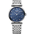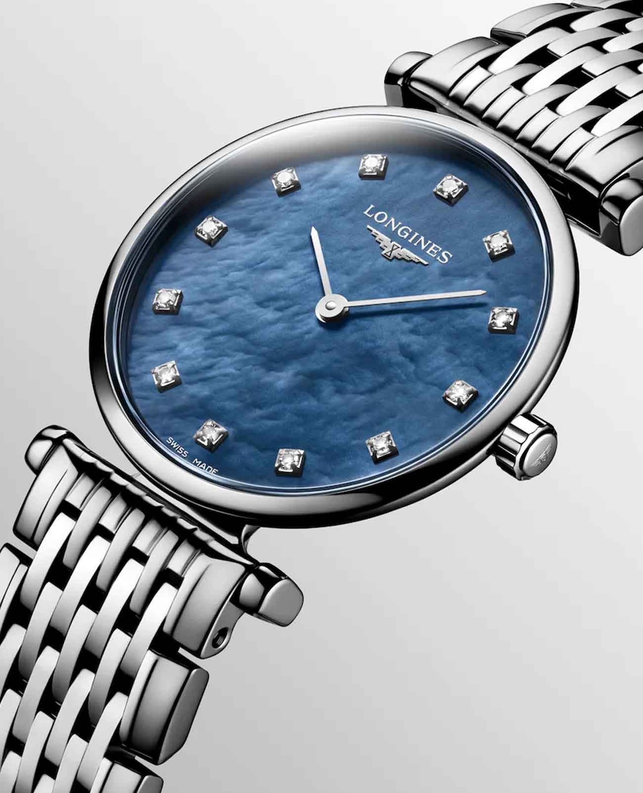 Часы Longines La Grande Classique de Longines (артикул L42094816) воплощают классическую элегантность и утонченность, присущие бренду Longines. Корпус диаметром 24 мм выполнен из нержавеющей стали и имеет толщину 4,30 мм, обеспечивая водозащиту до 3 бар (30 метров). Синий перламутровый циферблат украшен 12 бриллиантовыми часовыми метками общим весом 0,048 карата. Циферблат защищён сапфировым стекломСапфировое стеклоПрочный и надёжный материал из кристалла сапфира синтетического происхождения, характеризующийся особой твёрдостью и устойчивостью к царапинам и повреждениям..