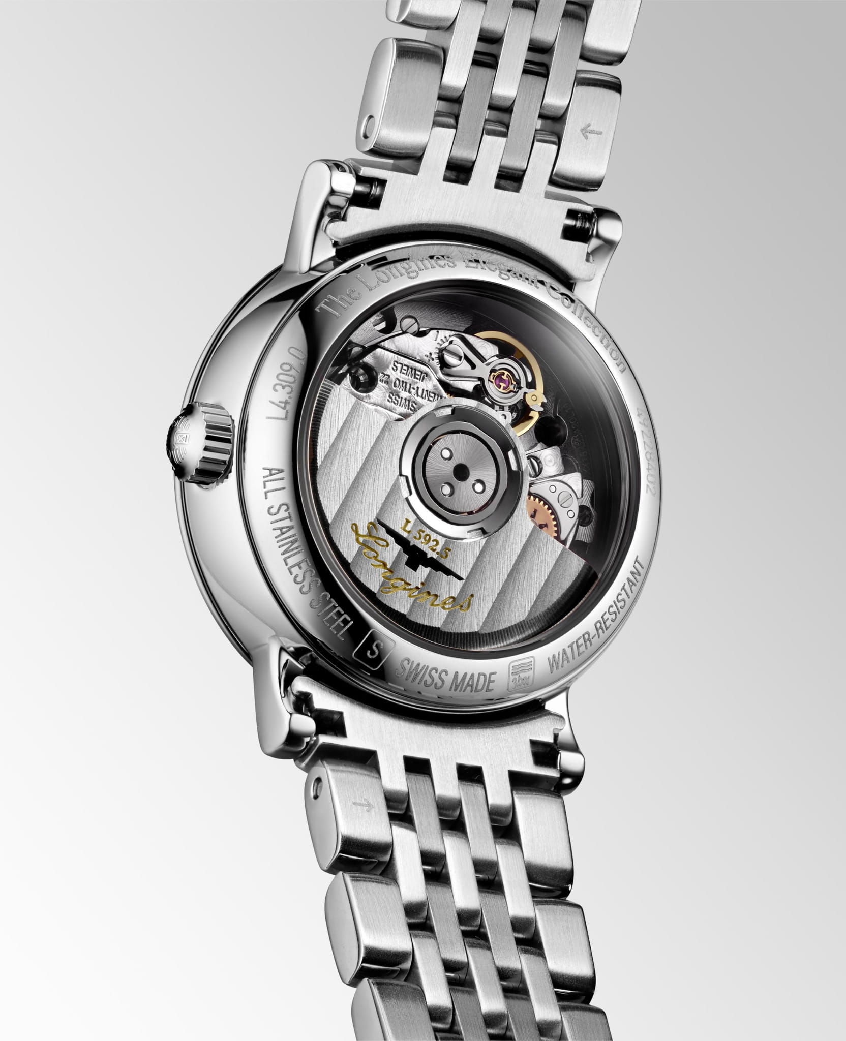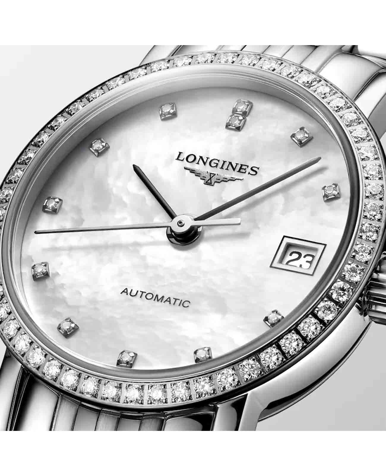 Швейцарские механические часы с автоподзаводом Longines Elegant L4.309.0.87.6. Сапфировое стеклоСапфировое стеклоПрочный и надёжный материал из кристалла сапфира синтетического происхождения, характеризующийся особой твёрдостью и устойчивостью к царапинам и повреждениям. с многослойным антибликовым покрытием с обеих сторон, устойчивое к появлению царапин, обладающее высокой прозрачностью. Корпус часов изготовлен из стали. Циферблат c 12 бриллиантами и корпус с 52 бриллиантами группы Top Wesselton VS-SI. Окошко даты находится в положении 3 часа. Класс водозащиты: 30 метров, позволит защитить корпус от случайных брызг или капель дождя. Стальной браслет на тройной раскладной застежке с системой блокировки и кнопкой.