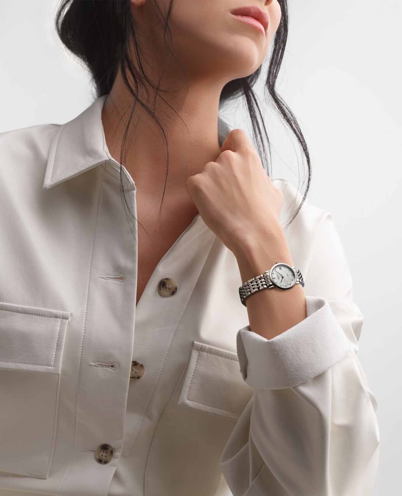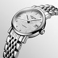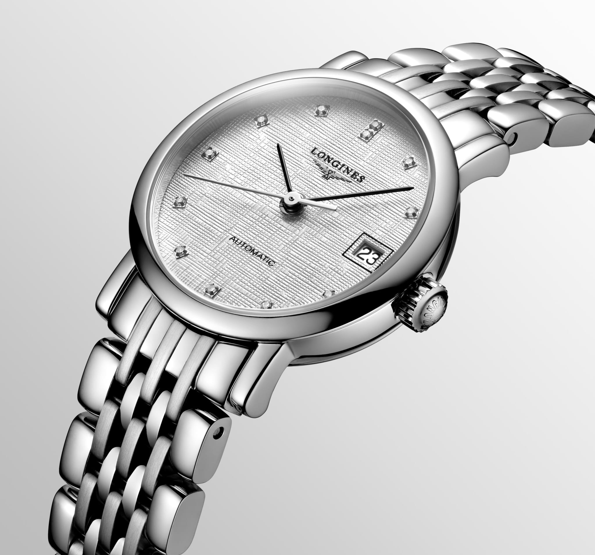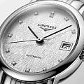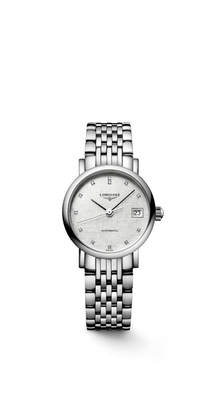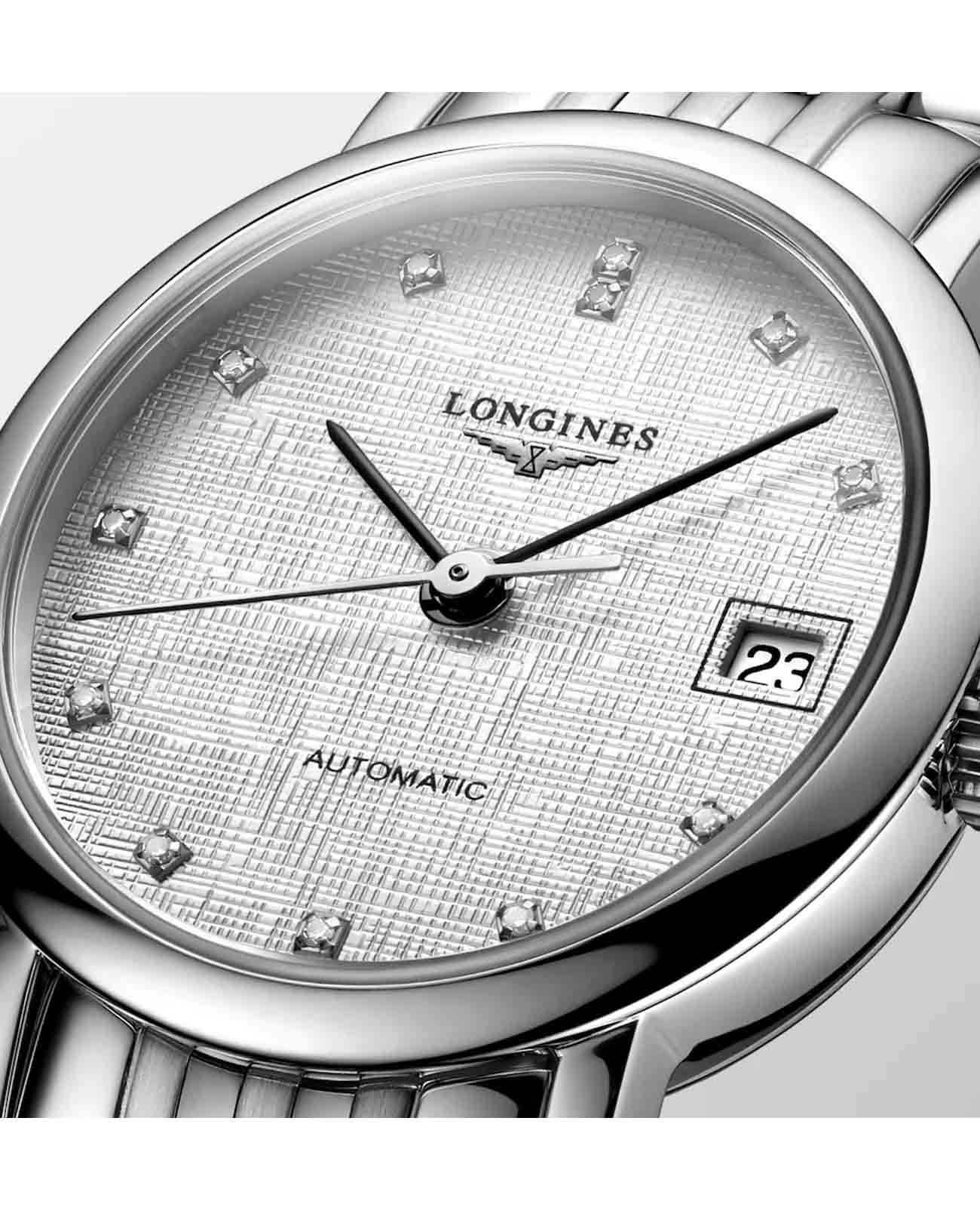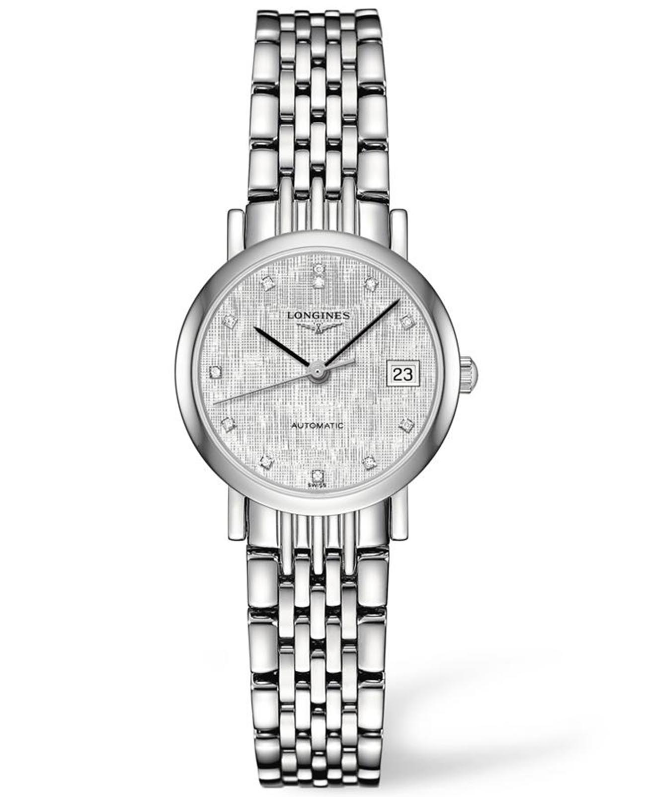 Швейцарские механические часы с автоподзаводом Longines Elegant L4.309.4.77.6. Сапфировое стеклоСапфировое стеклоПрочный и надёжный материал из кристалла сапфира синтетического происхождения, характеризующийся особой твёрдостью и устойчивостью к царапинам и повреждениям. с многослойным антибликовым покрытием с обеих сторон, устойчивое к появлению царапин, обладающее высокой прозрачностью. Корпус часов изготовлен из стали. Циферблат с 12 бриллиантами группы Top Wesselton VS-SI общим весом 0.026 карата. Окошко даты находится в положении 3 часа. Класс водозащиты: 30 метров, позволит защитить корпус от случайных брызг или капель дождя. Стальной браслет на застёжке «бабочка» с кнопкамиЗастёжка "бабочка"Такой вид застёжки дополняется предохранителями, помогающими избежать случайного раскрытия браслета. Обладают изящным исполнением. .