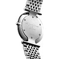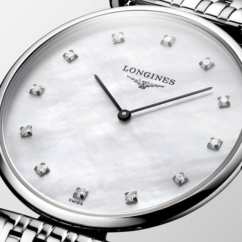 Перламутровый циферблат с 12 бриллиантами в 0,081 карата привлекательно смотрится в сочетании со стальным браслетом с мелкими звеньями. Швейцарский кварцевый механизм L420 обеспечивает высокую точность хода. Сапфировое стекло на 100% устойчиво к появлению царапин.