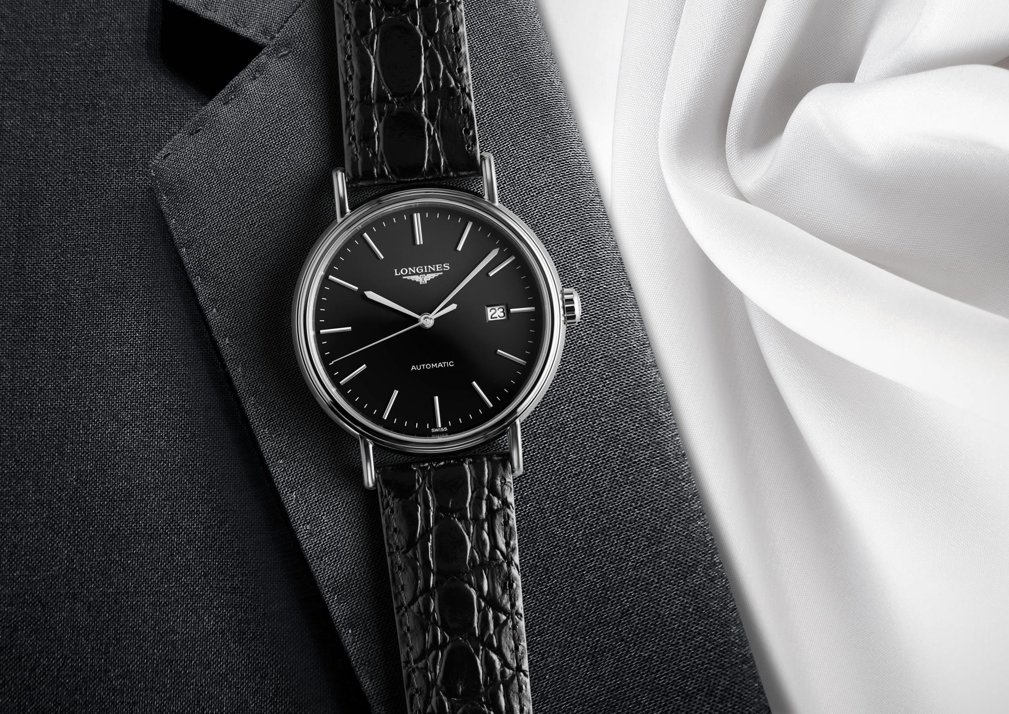 Нет ничего лишнего: лаконичные метки и стрелки, чёрный матовый циферблат, минималистичный стальной корпус, ремешок из натуральной кожи. Безупречная точность хода достигается за счёт швейцарского автоматического калибра L888 с 64-часовым запасом хода. Стильно смотрится прозрачная задняя крышка. Сапфировое стекло отличается устойчивостью к царапинам.