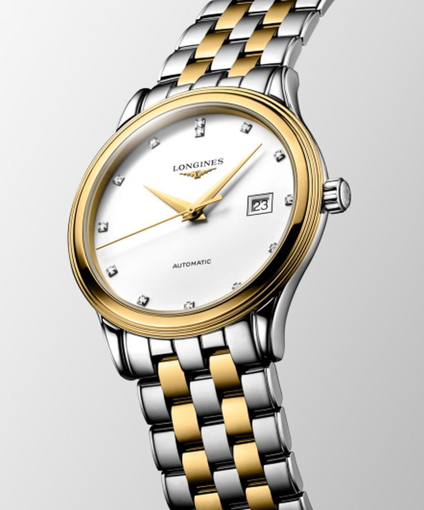 Longines L4.984.3.17.7 — классическая модель из серии Flagship Classic с утончённой эстетикой: корпус и браслет из нержавеющей стали с жёлтым PVDPVDУльтратонкое покрытие наносится в технике вакуумного напыления, сочетает в себе нитрид титана особой прочности со слоем золота или оксида хрома. Несёт в себе декоративную или защитную функцию.-покрытием, прозрачная задняя крышка из сапфира открывает вид на автоматический калибр L888 (25 200 пк/ч, монокристаллическая кремниевая пружина баланса), обеспечивающий запас хода до 72 ч ; выпуклое сапфировое стеклоСапфировое стеклоПрочный и надёжный материал из кристалла сапфира синтетического происхождения, характеризующийся особой твёрдостью и устойчивостью к царапинам и повреждениям. с несколькими слоями антибликового покрытияАнтибликовое покрытиеСлой оксида металла в 0,13-0,3 микрон, благодаря которому стекло часов не бликует и не отражает свет. Антибликовое покрытие уменьшает отражение света в 10 раз, обеспечивая отличную читаемость показателей циферблата. на внутренней стороне гарантирует отличную читаемость циферблата ; матовый белый циферблат украшен 13 бриллиантами Top Wesselton VS‑SI общим весом приблизительно 0,059 ct, стрелки — позолоченные . Диаметр корпуса 40 мм, толщина 8,7 мм, расстояние между ушками 21 мм, расстояние от ушка до ушка 47 мм, водозащита 3 бар (30 м), функции: часы, минуты, секунды и дата .