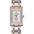 Женские швейцарские часы с бриллиантами Longines DolceVita L5.155.5.89.7, кварцевый механизм с высокой точностью. Сапфировое стеклоСапфировое стеклоПрочный и надёжный материал из кристалла сапфира синтетического происхождения, характеризующийся особой твёрдостью и устойчивостью к царапинам и повреждениям. устойчивое к появлению царапин, обладающее высокой прозрачностью. Класс водозащиты: 30 метров, позволит защитить корпус от случайных брызг или капель дождя. Браслет из нержавеющей стали со звеньями из розового золота. Фиксированный безель из нержавеющей стали с кольцом из розового золота и бриллиантами. Белый перламутровый циферблат с черными стрелками и бриллиантовыми часовыми метками. Застёжка бабочка с кнопкамиЗастёжка "бабочка"Такой вид застёжки дополняется предохранителями, помогающими избежать случайного раскрытия браслета. Обладают изящным исполнением. .