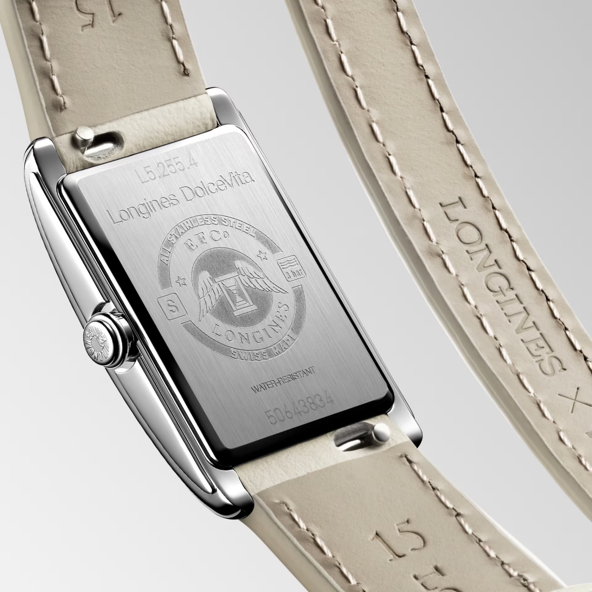 Женские швейцарские часы Longines DolceVita L5.255.4.79.2, кварцевый механизм с высокой точностью. Сапфировое стеклоСапфировое стеклоПрочный и надёжный материал из кристалла сапфира синтетического происхождения, характеризующийся особой твёрдостью и устойчивостью к царапинам и повреждениям. устойчивое к появлению царапин, обладающее высокой прозрачностью. Корпус часов изготовлен из нержавеющей стали. Метки в виде римских цифр. Малая секундная стрелка в положении 6 часов. Класс водозащиты: 30 метров, позволит защитить корпус от случайных брызг или капель дождя. Ремешок из кожи на стандартной застежке.