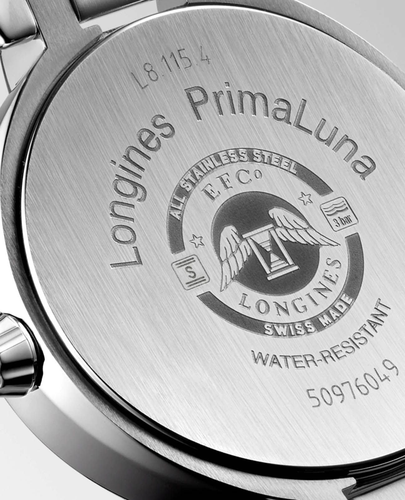 Женские швейцарские часы Longines PrimaLuna L8.115.4.92.6, кварцевый механизм с высокой точностью. Исключительно женственная коллекция. Округлые, нежные линии Longines Prima Luna - дань преклонения перед женственной Луной, символом переменчивости времени. Сапфировое стеклоСапфировое стеклоПрочный и надёжный материал из кристалла сапфира синтетического происхождения, характеризующийся особой твёрдостью и устойчивостью к царапинам и повреждениям. устойчивое к появлению царапин, обладающее высокой прозрачностью. Корпус часов изготовлен из нержавеющей стали. Окошко даты в положении 3 часов. Указатель фазы луны в положении 6 часов. Класс водозащиты: 30 метров, позволит защитить корпус от случайных брызг или капель дождя. Стальной браслет на застёжке «бабочка» с кнопкамиЗастёжка "бабочка"Такой вид застёжки дополняется предохранителями, помогающими избежать случайного раскрытия браслета. Обладают изящным исполнением. .