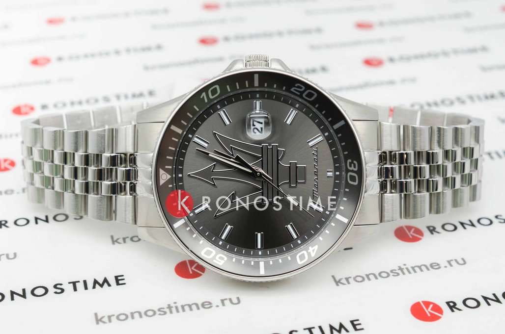 Модель Maserati Sfida R8853140010 — воплощение стиля и функциональности для современных мужчин, ценящих качество и элегантность. Корпус диаметром 44 мм выполнен из нержавеющей стали, обеспечивая прочность и долговечность. Минеральное стеклоМинеральное стеклоМинеральное стекло представляет собой искусственно выращенный минерал кварца. Такое стекло отличается особой устойчивостью к повреждениям и царапинам. Уступает по некоторым качествам сапфировому стеклу. надежно защищает синий циферблат с изящными рисками, придавая часам утонченный вид. Благодаря водостойкости до 100 метров (10 АТМ), эти часы станут вашим надежным спутником в любых условиях, будь то деловая встреча или активный отдых. Люминесцентное покрытиеЛюминесцентное покрытиеПозволяет считывать показания времени в темноте. Производители наносят на стрелки, часовые индексы, безель или поверхность циферблата светонакопительный состав, дающий холодное свечение. на стрелках и метках обеспечивает отличную видимость в темноте. Завершающий штрих — стальной браслет с раскладной застёжкойРаскладная застёжкаТакой тип застёжки используется только на браслетах из металла. Она никогда не раскрывается полностью, происходит разделение на 2 и более частей. Раскладывающая застёжка снизит вероятность потери часов к минимуму., который подчеркивает общий стиль, обеспечивая комфорт и надежность в носке. Вращающийся стальной безельБезельВнешний ободок, закрепляющий стекло. В спортивных часах так называется поворотное кольцо с делениями на циферблате, выполняет роль таймера – замеряет отрезки времени на шкале. Неподвижный безель – элемент декора. Однонаправленно вращающийся безель на дайверских часах позволяет фиксировать моменты погружения и выныривания на поверхность. с IP-покрытиемIP-покрытиеМетод ионного напыления. Демонстрирует повышенную устойчивость к истиранию, окислению и химическим веществам. Под воздействием высокого давления и температуры около 1500°C молекулы металла надёжно соединяются с частицами корпуса часов.. Циферблат выполнен по технологии Sunray (солнечные лучи) и украшен фирменным логотипом «Maserati». Метки в виде штрихов. Окошко даты с увеличительным стеклом находится в положении 3 часа.