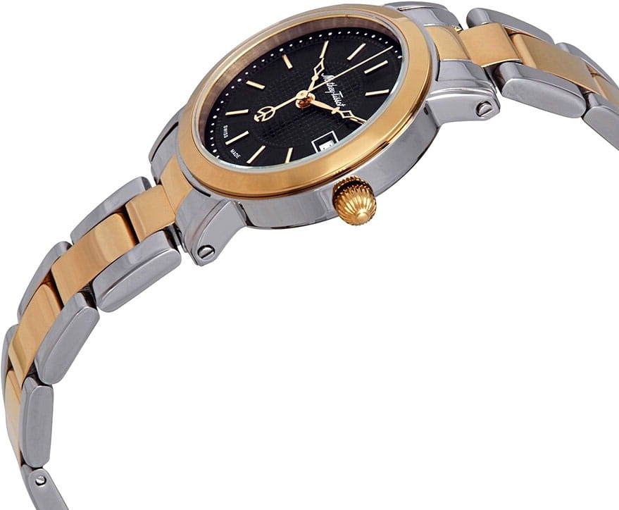 Женские кварцевые часы Mathey-Tissot City Metal D31186MBN — это стильное сочетание элегантности и современного дизайна. Изящный корпус выполнен из стали 316L с безелемБезельВнешний ободок, закрепляющий стекло. В спортивных часах так называется поворотное кольцо с делениями на циферблате, выполняет роль таймера – замеряет отрезки времени на шкале. Неподвижный безель – элемент декора. Однонаправленно вращающийся безель на дайверских часах позволяет фиксировать моменты погружения и выныривания на поверхность. с PVD-покрытиемPVDУльтратонкое покрытие наносится в технике вакуумного напыления, сочетает в себе нитрид титана особой прочности со слоем золота или оксида хрома. Несёт в себе декоративную или защитную функцию., что придаст образу женственности и романтизма. Изысканный циферблат с метками в виде штрихов придает модели особый блеск и защищен минеральным стекломМинеральное стеклоМинеральное стекло представляет собой искусственно выращенный минерал кварца. Такое стекло отличается особой устойчивостью к повреждениям и царапинам. Уступает по некоторым качествам сапфировому стеклу., обеспечивающим устойчивость к царапинам. Часы оснащены надежным кварцевым механизмом. Окошко даты находится в положении 3 часа. Стальной браслет с частичным PVD-покрытиемPVDУльтратонкое покрытие наносится в технике вакуумного напыления, сочетает в себе нитрид титана особой прочности со слоем золота или оксида хрома. Несёт в себе декоративную или защитную функцию.  на раскладной застёжкеРаскладная застёжкаТакой тип застёжки используется только на браслетах из металла. Она никогда не раскрывается полностью, происходит разделение на 2 и более частей. Раскладывающая застёжка снизит вероятность потери часов к минимуму., гарантирующего комфортное и безопасное ношение. Класс водозащиты: 50 метров позволит защитить корпус от случайных брызг или капель дождя. Mathey-Tissot  — отличный выбор для тех, кто ценит утонченность и качество.