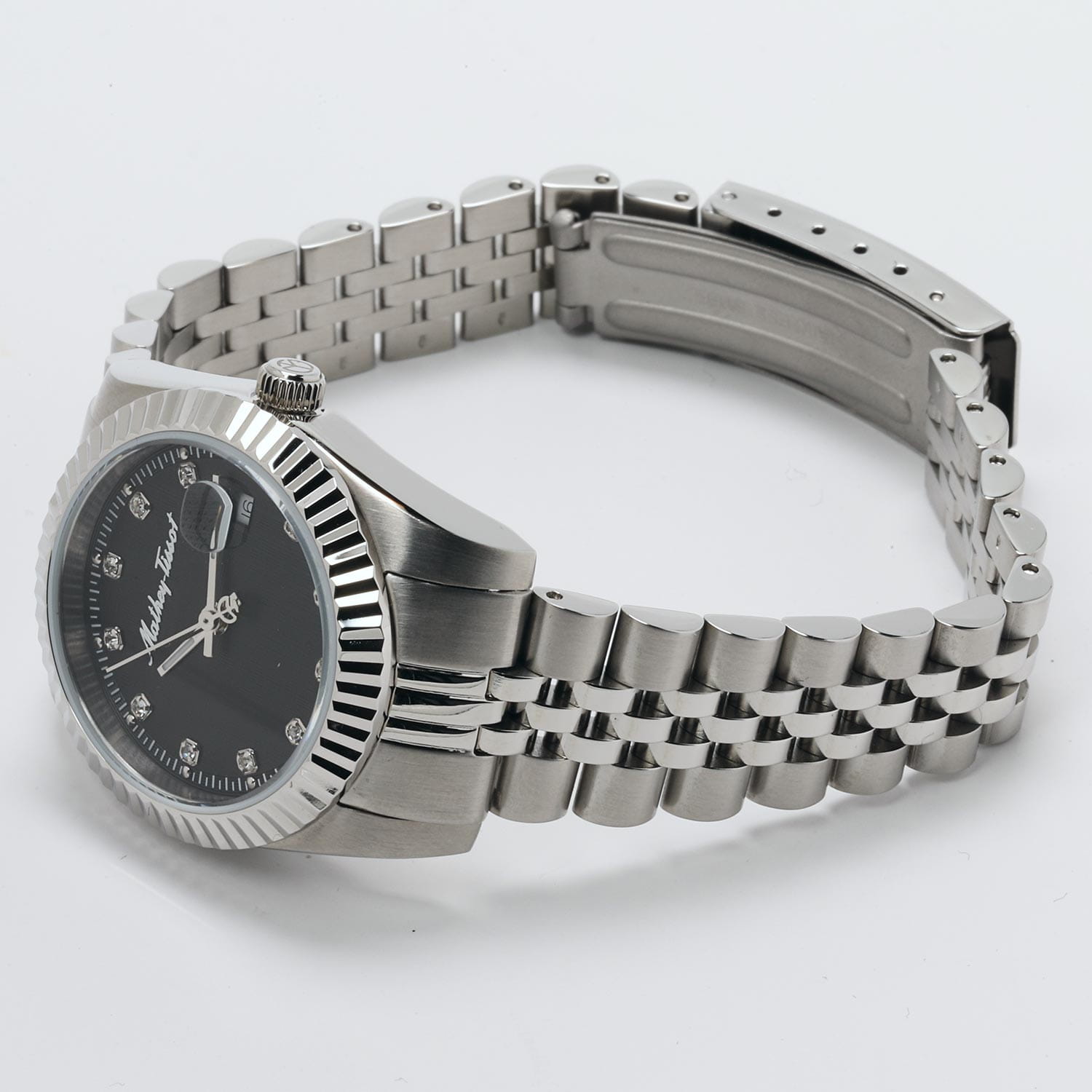Женские кварцевые часы Mathey-Tissot Rolly D810AN — это стильное сочетание элегантности и современного дизайна. Изящный корпус выполнен из нержавеющей стали, диаметром 30 мм, что придаст образу женственности и романтизма. Изысканный циферблат с метками в виде точек придает модели особый блеск. Циферблат защищен минеральным стекломМинеральное стеклоМинеральное стекло представляет собой искусственно выращенный минерал кварца. Такое стекло отличается особой устойчивостью к повреждениям и царапинам. Уступает по некоторым качествам сапфировому стеклу., обеспечивающий устойчивость к царапинам. Стрелки с люминесцентным покрытиемЛюминесцентное покрытиеПозволяет считывать показания времени в темноте. Производители наносят на стрелки, часовые индексы, безель или поверхность циферблата светонакопительный состав, дающий холодное свечение.. Рифленый безельБезельВнешний ободок, закрепляющий стекло. В спортивных часах так называется поворотное кольцо с делениями на циферблате, выполняет роль таймера – замеряет отрезки времени на шкале. Неподвижный безель – элемент декора. Однонаправленно вращающийся безель на дайверских часах позволяет фиксировать моменты погружения и выныривания на поверхность. серебристого цвета. Циферблат украшен кристаллами. Окошко даты находится в положении 3 часа. Часы оснащены надежным кварцевым механизмом. Стальной браслет на раскладной застёжкеРаскладная застёжкаТакой тип застёжки используется только на браслетах из металла. Она никогда не раскрывается полностью, происходит разделение на 2 и более частей. Раскладывающая застёжка снизит вероятность потери часов к минимуму., гарантирует комфортное и безопасное ношение. Класс водозащиты: 50 метров позволит защитить корпус от случайных брызг или капель дождя. Mathey-Tissot  — отличный выбор для тех, кто ценит утонченность и качество.