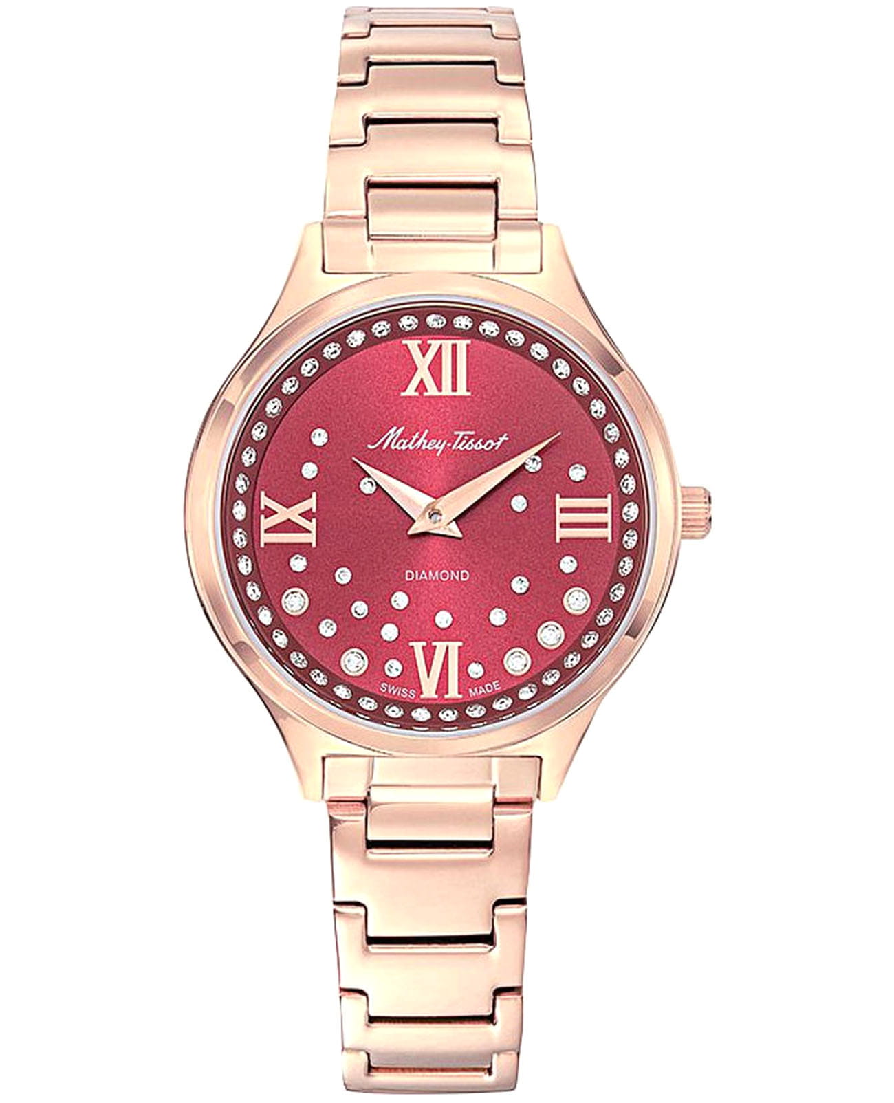 Женские кварцевые часы Mathey-Tissot Nicole D985SPR — это стильное сочетание элегантности и современного дизайна. Изящный корпус выполнен из нержавеющей стали с PVD-покрытиемPVDУльтратонкое покрытие наносится в технике вакуумного напыления, сочетает в себе нитрид титана особой прочности со слоем золота или оксида хрома. Несёт в себе декоративную или защитную функцию. цвета розового золота, диаметром 32 мм, прекрасно впишется в ваш исключительный стиль. Изысканный циферблат с метками в виде римских цифр придает модели особый блеск и защищен сапфировым стекломСапфировое стеклоПрочный и надёжный материал из кристалла сапфира синтетического происхождения, характеризующийся особой твёрдостью и устойчивостью к царапинам и повреждениям., обеспечивающим устойчивость к царапинам. Циферблат украшен кристаллами. Мечевидные стрелки в стиле Dauphine. Часы оснащены надежным кварцевым механизмом. Рифленая заводная головка. Стальной браслет с PVD-покрытиемPVDУльтратонкое покрытие наносится в технике вакуумного напыления, сочетает в себе нитрид титана особой прочности со слоем золота или оксида хрома. Несёт в себе декоративную или защитную функцию. на застёжке-бабочке с кнопкамиЗастёжка "бабочка"Такой вид застёжки дополняется предохранителями, помогающими избежать случайного раскрытия браслета. Обладают изящным исполнением. гарантирует комфортное и безопасное ношение. Класс водозащиты: 50 метров позволит защитить корпус от случайных брызг или капель дождя. Mathey-Tissot  — отличный выбор для тех, кто ценит утонченность и качество.